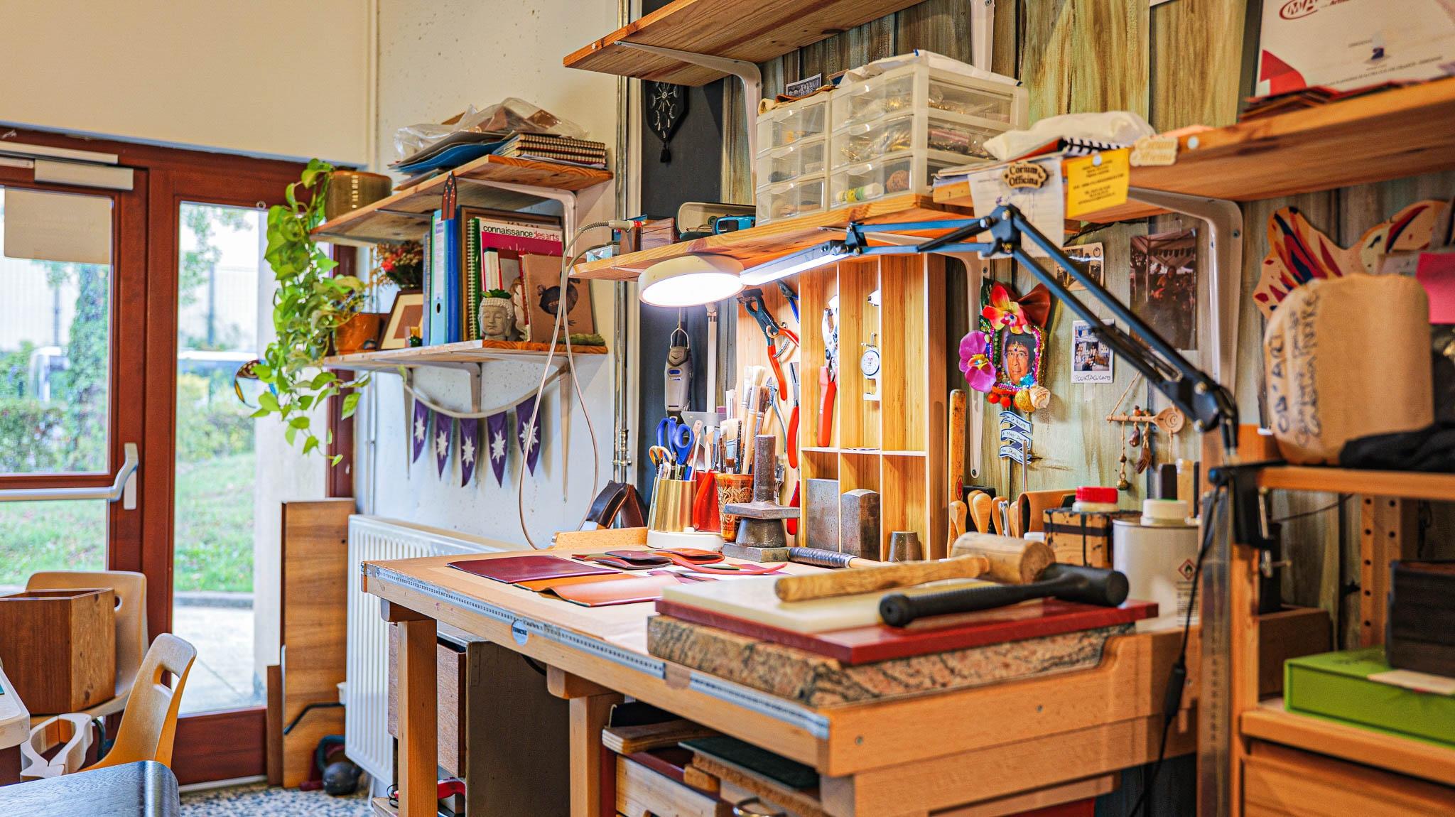 Passionnée par l’histoire de l’art, la passionnée crée des objets de maroquinerie à l’aide d’outils traditionnels de sellerie. Son atelier se trouve dans un lieu unique, un tiers-lieu où elle partage l’espace avec une joaillière et un restaurant, un véritable centre créatif.