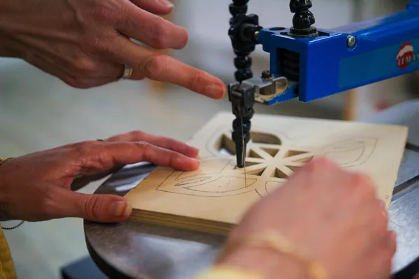Depuis l’enfance, Marie aime bricoler. Aux côtés de son père menuisier, elle découvre très tôt le plaisir de façonner le bois, de le sentir, de le transformer. Elle s’oriente pourtant tout d'abord vers l'enseignement, et exerce en tant que professeure de mathématiques pendant 13 ans. Après avoir ouvert une école alternative, Marie décide finalement de se consacrer pleinement au chantournage en 2021, une technique qu'elle découvre pendant le confinement. Cette technique de découpe fine du bois lui ouvre un champ créatif infini : elle crée aujourd'hui de nombreuses pièces, dont des luminaires. Passionnée et pédagogue, Marie sera ravie de vous ouvrir les portes de son univers unique, entre douceur, création, ombre et lumière !