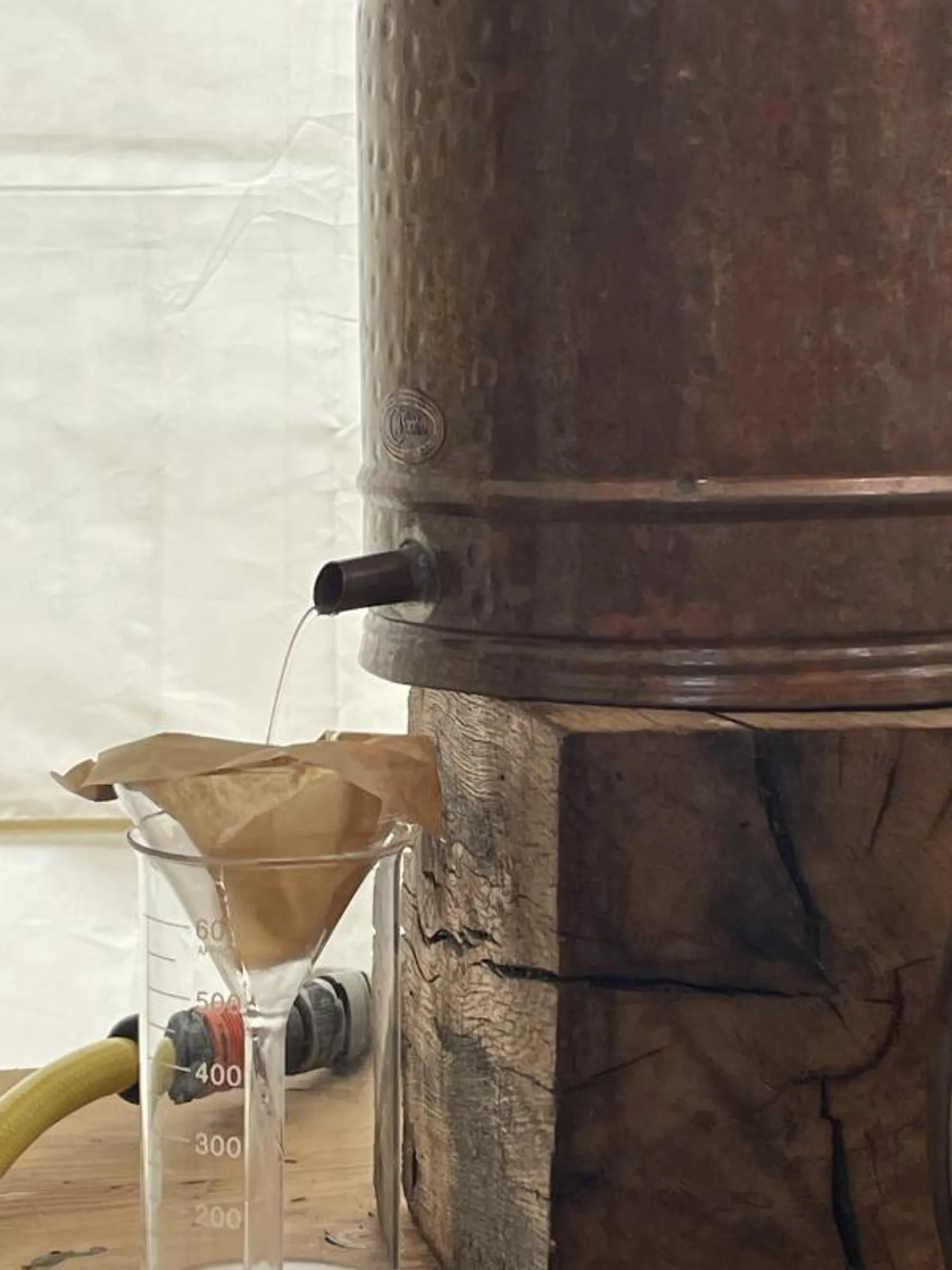 Une fois l’alambic chargé, vous suivrez chaque étape avec Carine : chauffe, condensation, puis récolte lente et progressive de votre eau florale.