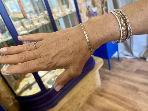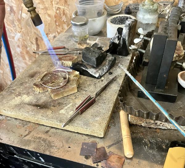 Vous apprendrez dans un premier temps à mesurer votre taille de poignet. Ensuite viendra l'étape de texturer une bande d'argent par la méthode du martelage du métal et à couper pour ensuite la souder.