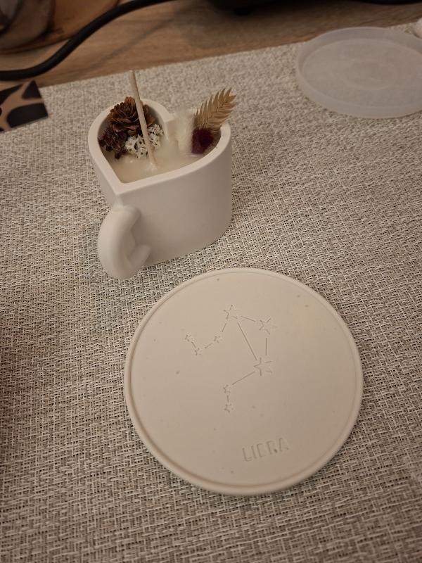 Pour la coupelle astrologique, vous peserez les matières premières et procéderez au coulage dans un moule. Après un temps de séchage nécessaire, vous poncerez les surfaces pour obtenir un rendu lisse et harmonieux, puis appliquerez un vernis pour finaliser l’objet.