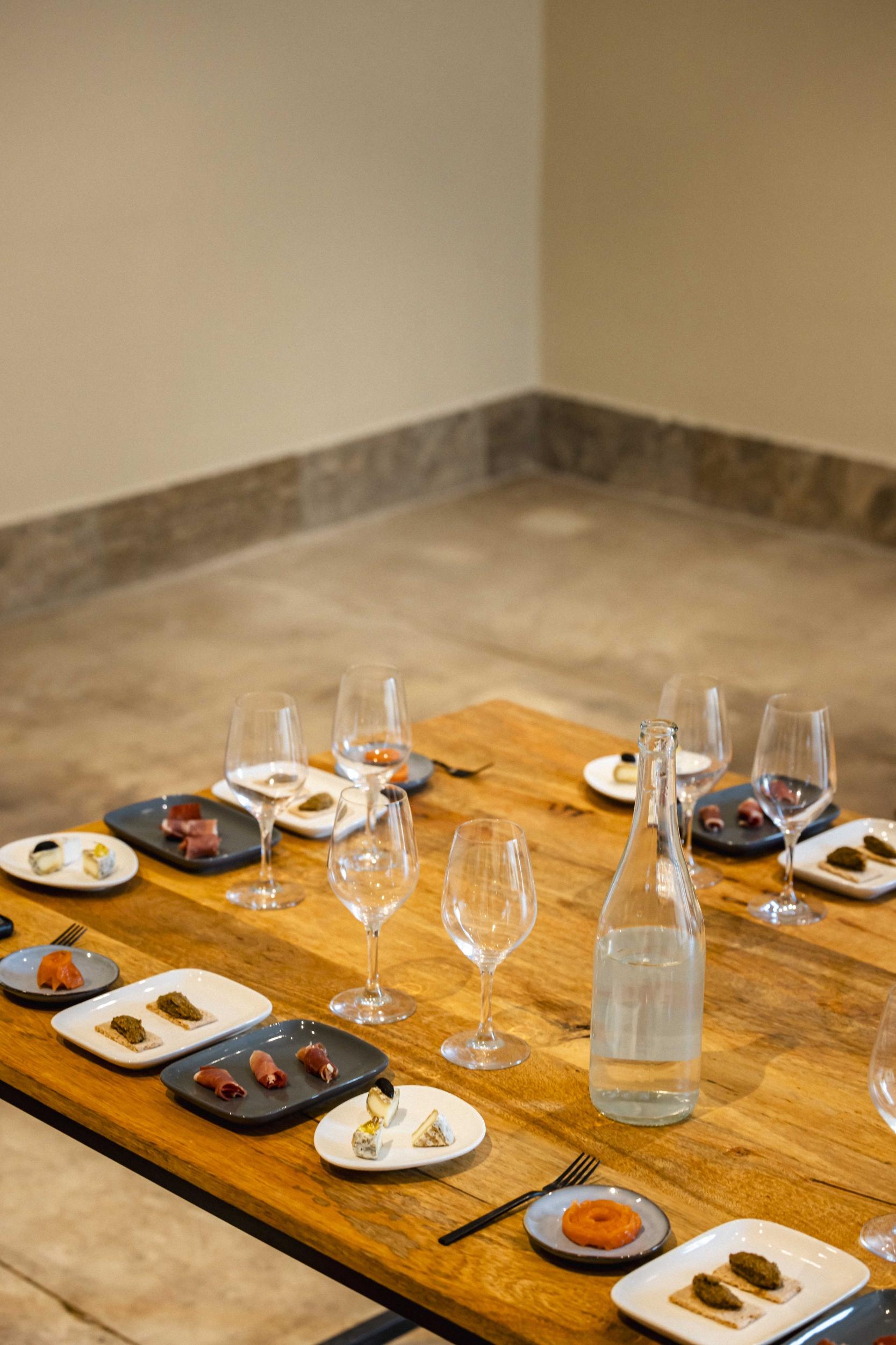 Présentation des mets ardéchois : chaque vin est associé à un produit typique de l’Ardèche, sélectionné auprès de producteurs locaux partageant les mêmes principes de culture. Tapenade, huile d’olive artisanale, jambon de Mangalitza… Tout est sans gluten et accompagné de craquottes pour une dégustation optimale.