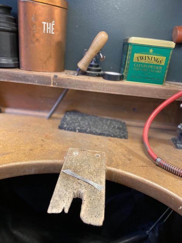 • Découpe au bocfil : familiarisez-vous d’abord avec le bocfil (scie à métal) en découpant une plaque d’argent selon le patron de votre bague. Une fois la bande découpée, créez l’effet de matière de votre pièce à l’aide de marteaux ou de bouterolles, pour lui donner son caractère unique.