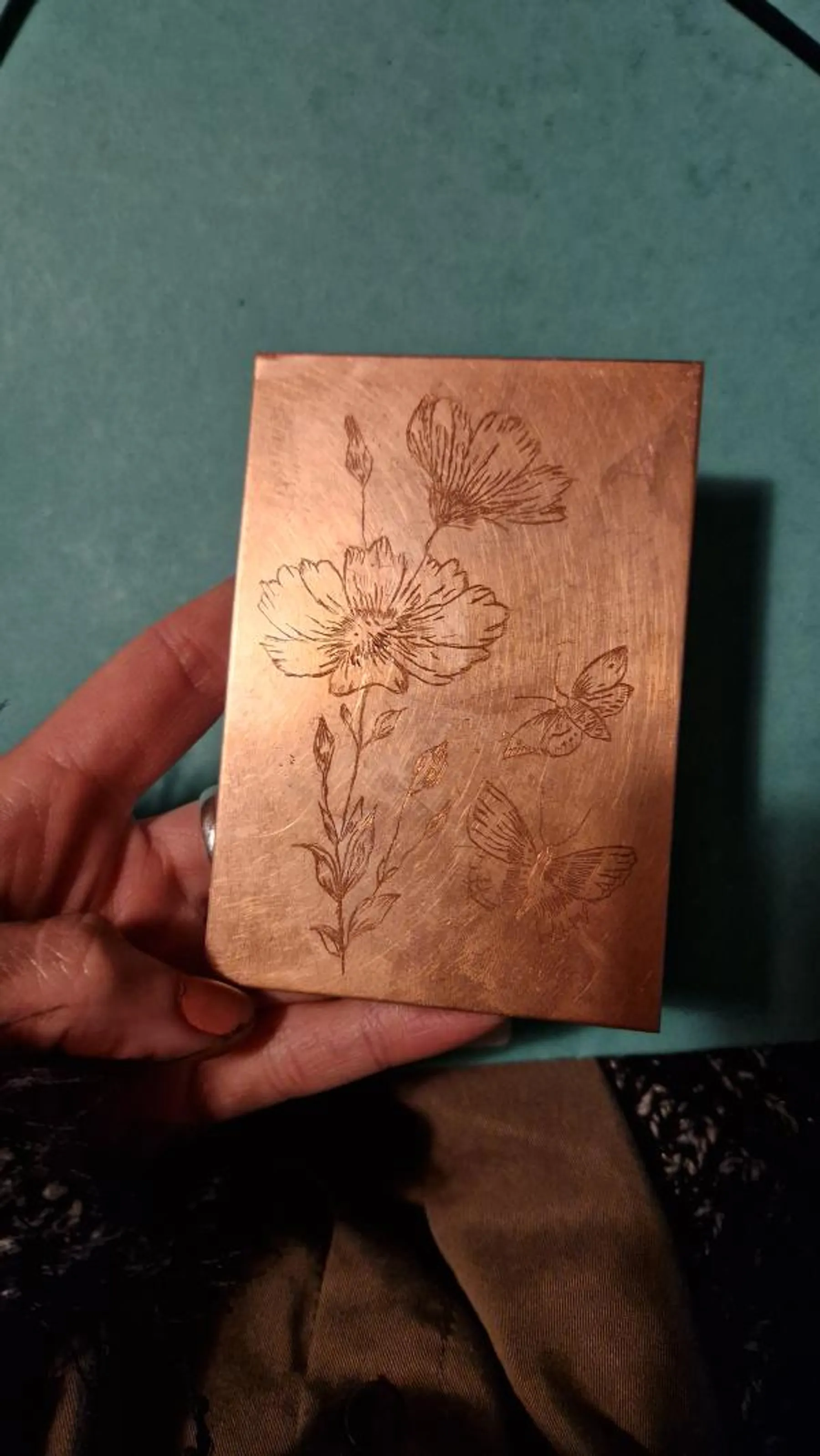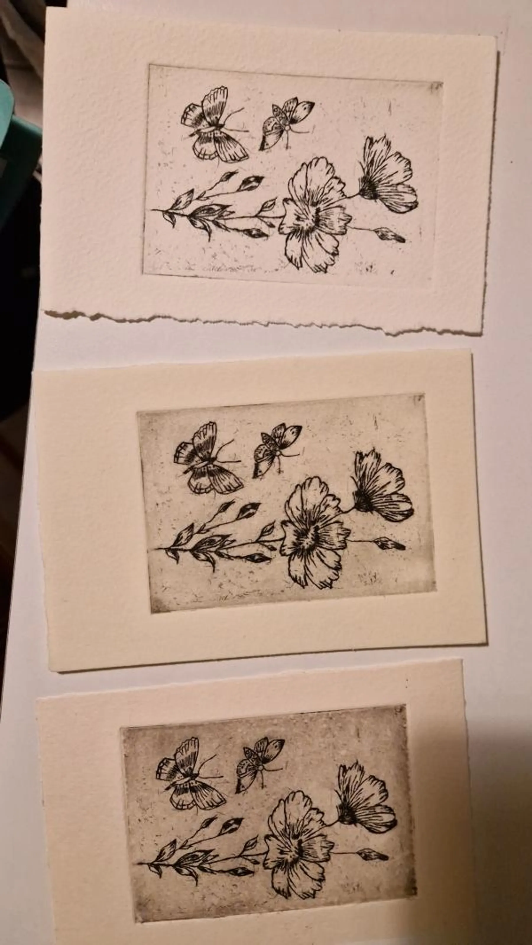 Votre jolie plaque en cuivre gravée (10 x 15 cm) et vos 4 à 6 impressions uniques (15 x 20 cm chacune)