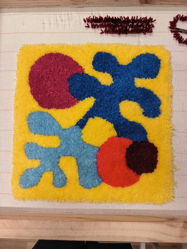 Super atelier : Caroline explique très bien et nous guide pour réaliser le motif tufté de notre coussin. L'atelier se déroule dans une très bonne ambiance, détendue et concentrée.