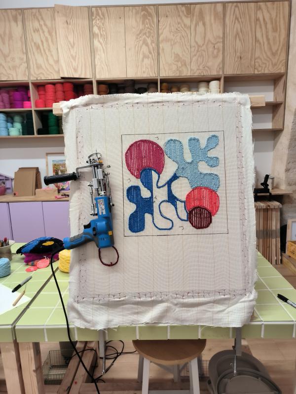 Ensuite, place à la pratique avec le pistolet à tufter ! Vous apprendrez à manipuler cet outil pour donner vie à votre design sur la toile, en suivant les conseils de Caroline pour garantir des formes régulières et un rendu harmonieux.