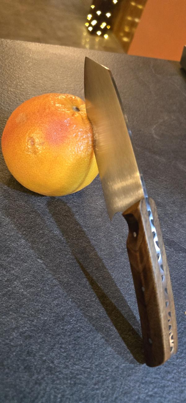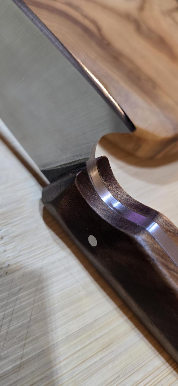Samedi 23/10, j'ai passé une très agréable journée en compagnie de Rémi, qui tout au long de la journée m'a fait découvrir sa passion : La coutellerie. Il partage avec enthousiasme son savoir (les aciers, techniques de chauffe...), son savoir-faire et surtout m'a accompagné pour la fabrication de ce magnifique couteau de cuisine, de la découpe de la forme, en passant par l'emouturage, la fabrication du manche, à la finition. Au final j'ai appris et fait plein de choses que je ne connaissait pas. Et quelle satisfaction au final de repartir avec un bel objet artisanal.