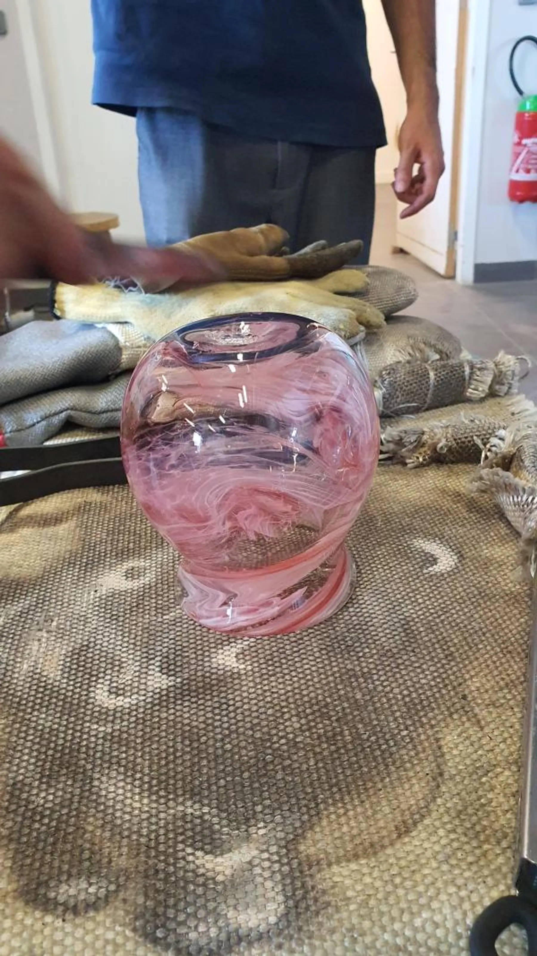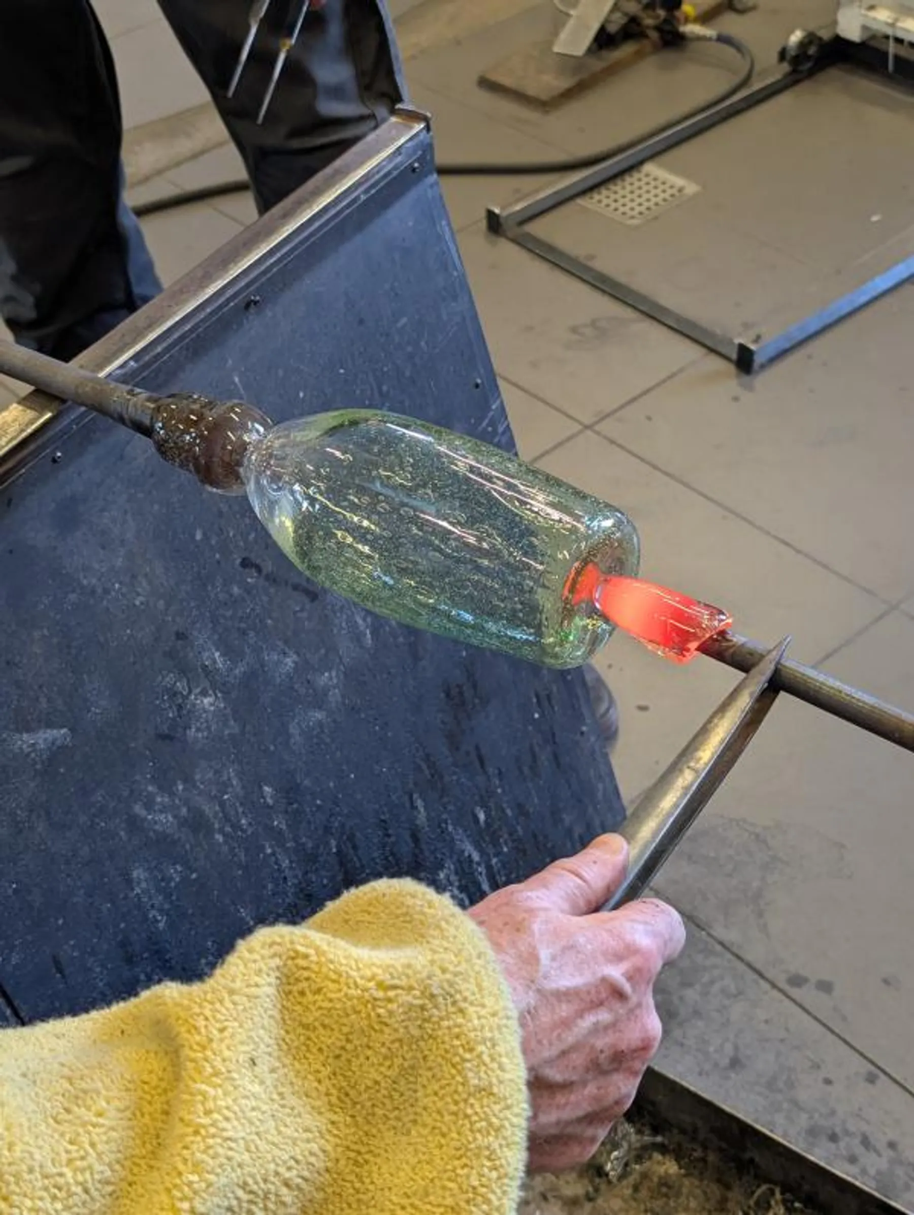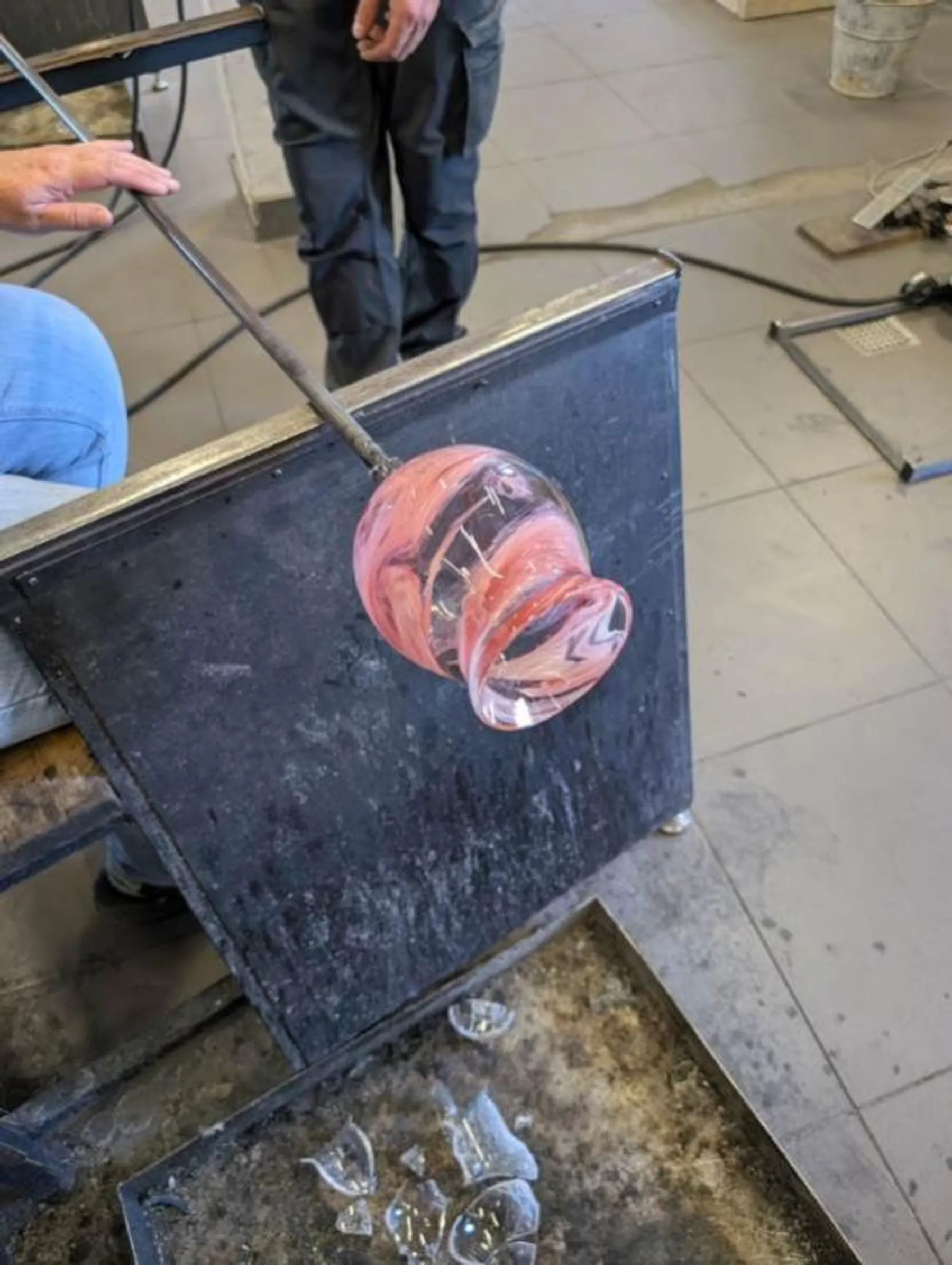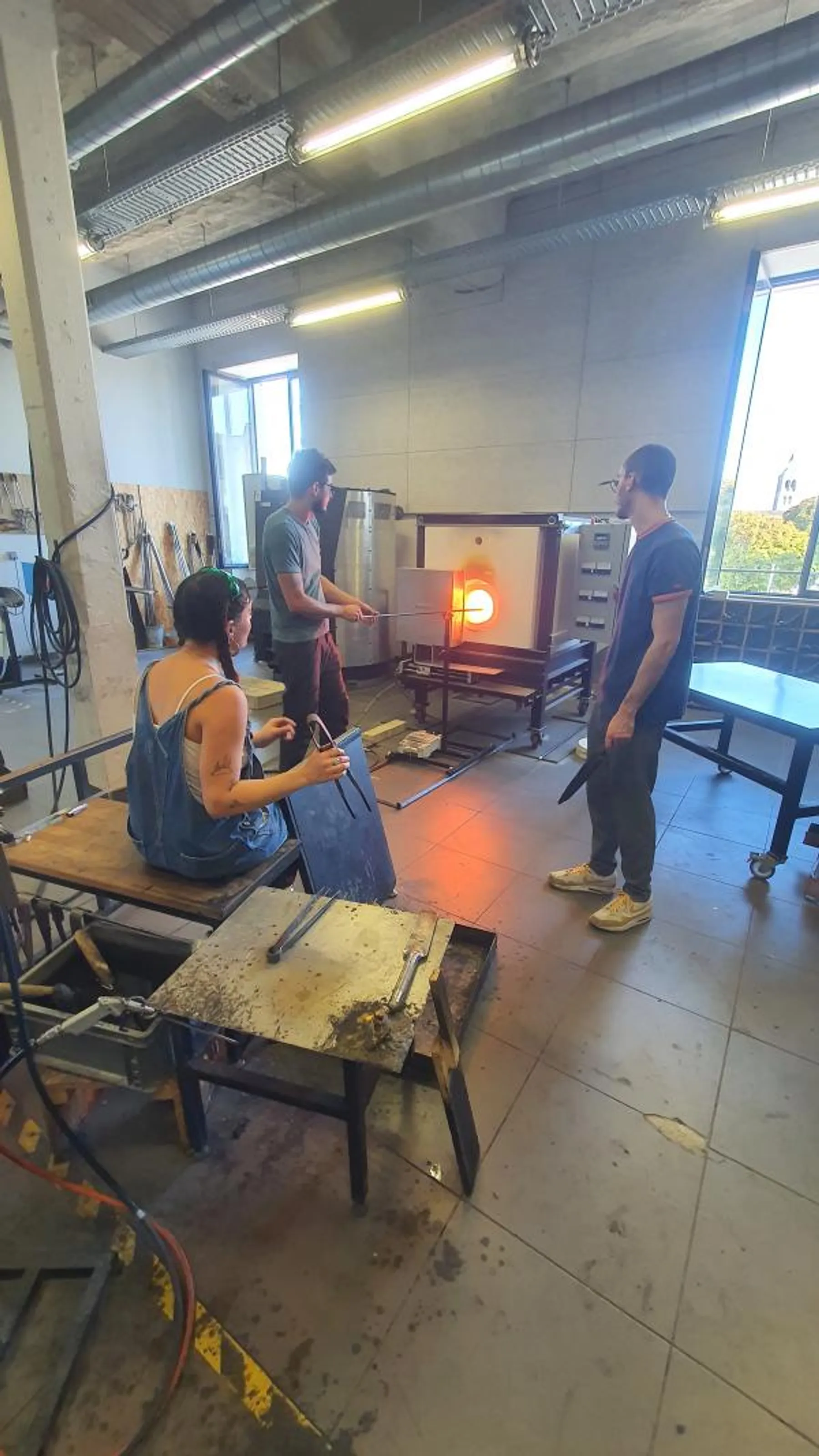Vous commencerez par vous exercer à récupérer du verre en fusion et à le manipuler, une étape impressionnante qui vous mettra immédiatement dans l’ambiance. L’atelier sera organisé en petits groupes afin que chacun profite d’un accompagnement personnalisé. Avec Valentin, vous soufflerez votre premier verre, tandis que Gaëtan vous fera expérimenter les gestes et techniques de base du soufflage pour vous familiariser avec la matière.