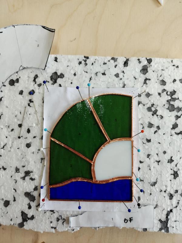L'aventure se poursuivra avec la partie pratique. Vous découperez les morceaux de verre selon un gabarit, avant de les meuler pour obtenir la forme souhaitée. L'application de la bande de cuivre sur chaque morceau et la soudure des contours à l'étain solidifieront l'ensemble.