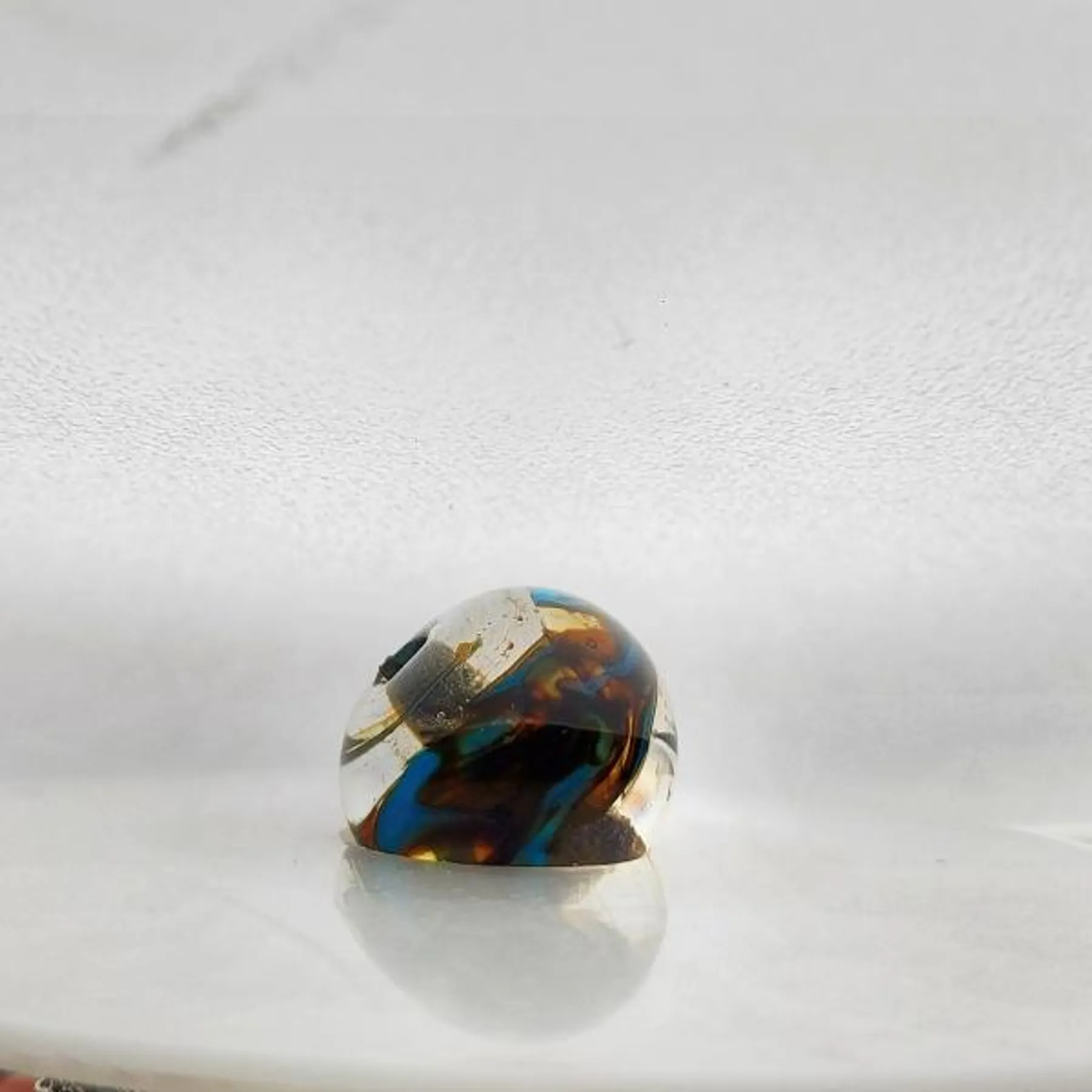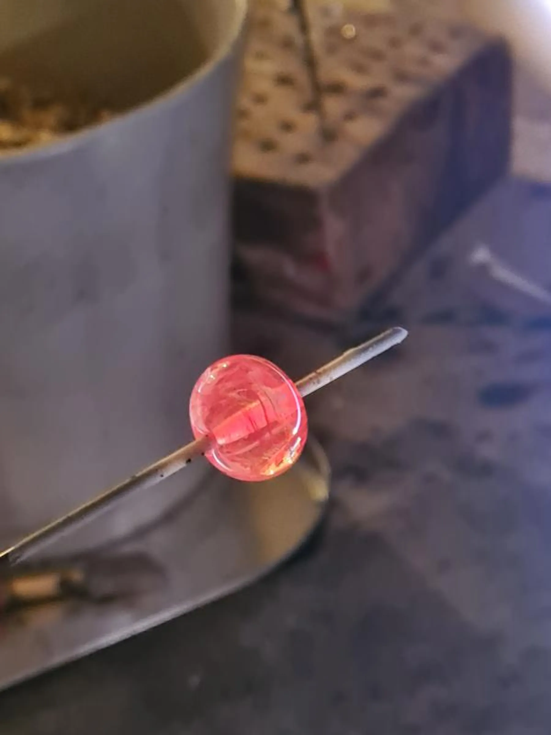 Par la suite, vous réalisez une ou deux perles, en choisissant les couleurs qui vous plaisent. Vous ajoutez, avec les fils déjà étirés, des motifs directement sur votre perle encore chaude.