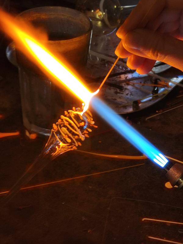 L’atelier commence par un rapide cours théorique. Vous prenez ensuite en main des baguettes de verre colorées que vous chaufferez devant une flamme à plus de 1200°.