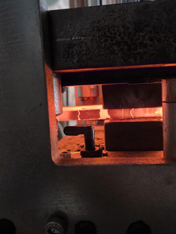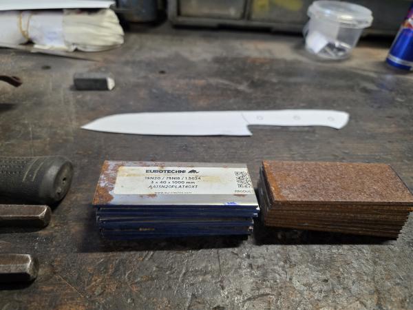 Ensuite, vous commencerez à créer "la trousse" en Damas de votre couteau, à partir de deux aciers différents en 15 couches (xc75 et 15n20,) à l'aide d'une presse, jusqu'à finalement atteindre entre 100 à 200 couches.
