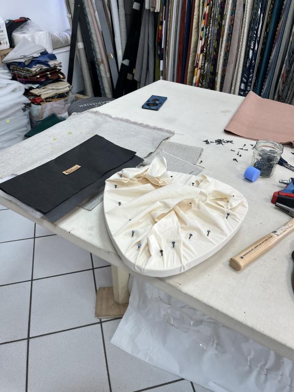 Delphine vous présentera alors les possibilités de modèles de chaises et tabouret ainsi que la gamme de tissus disponibles dans son atelier.