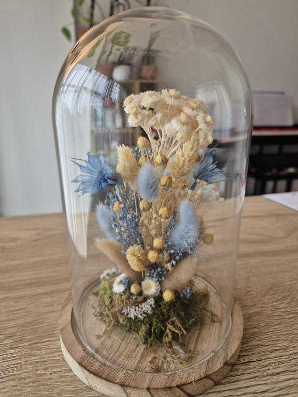Tout d'abord, vous recevrez une belle cloche en verre avec une base en bois. Ensuite, vous aurez un grand choix de fleurs séchées. Petit à petit, il vous montrera comment composer l'assemblage de la décoration sous cloche. Une fois le tout composé selon votre goût, vous n'aurez plus qu'à fixer le tout et venir y déposer le dôme de verre au-dessus.