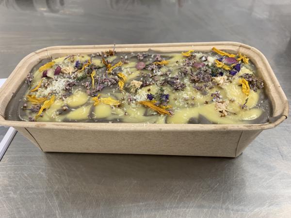 À l'issue de l'atelier, vous emporterez chez vous votre pain de savon artisanal de 800 grammes. Vous pourrez ensuite le découper selon vos préférences, qu'il soit uni ou marbré, pour créer des morceaux uniques et personnalisés.