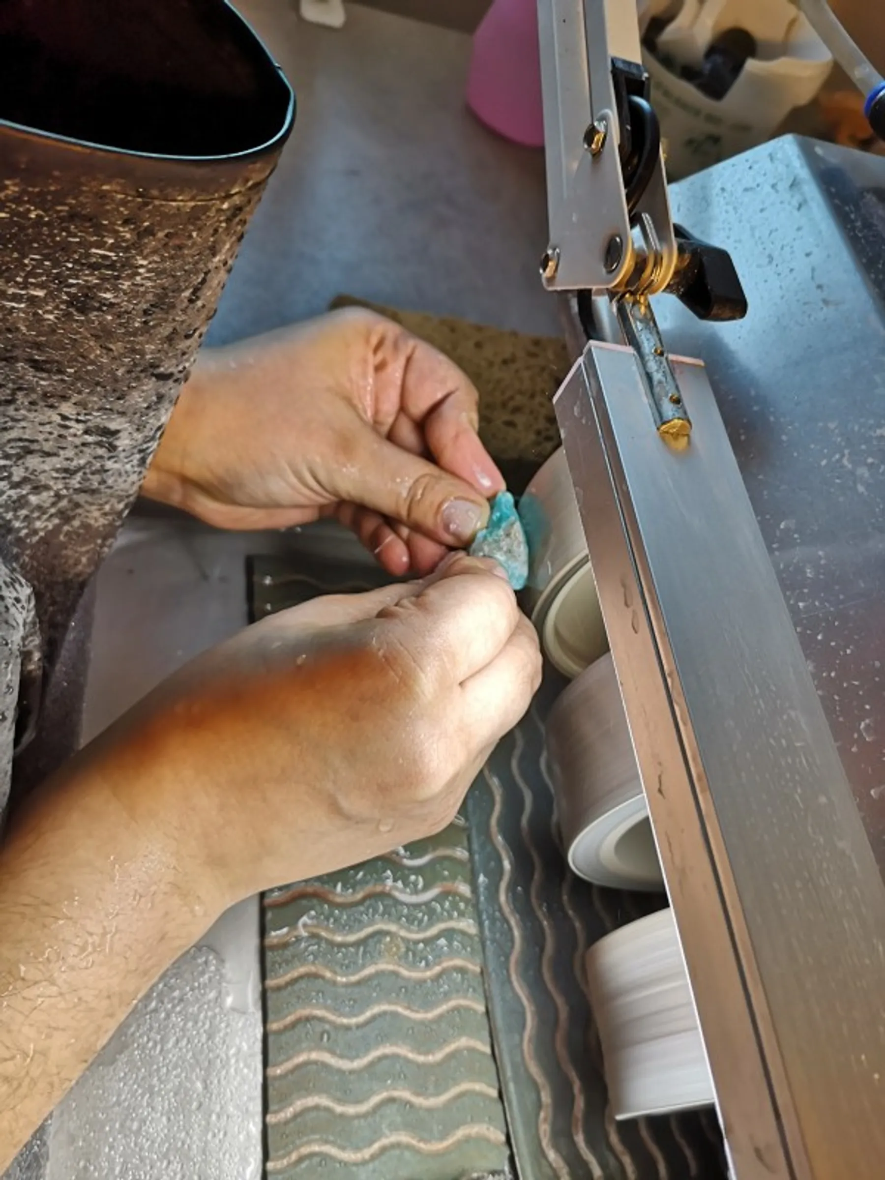 Ensuite vous choisirez ensemble la pierre à tailler et la forme que vous lui ferez prendre ainsi que sa future utilisation (pendentif, etc). Puis vous scierez la pierre si c'est nécessaire pour qu'elle ait une forme aussi proche que possible de sa forme finale.