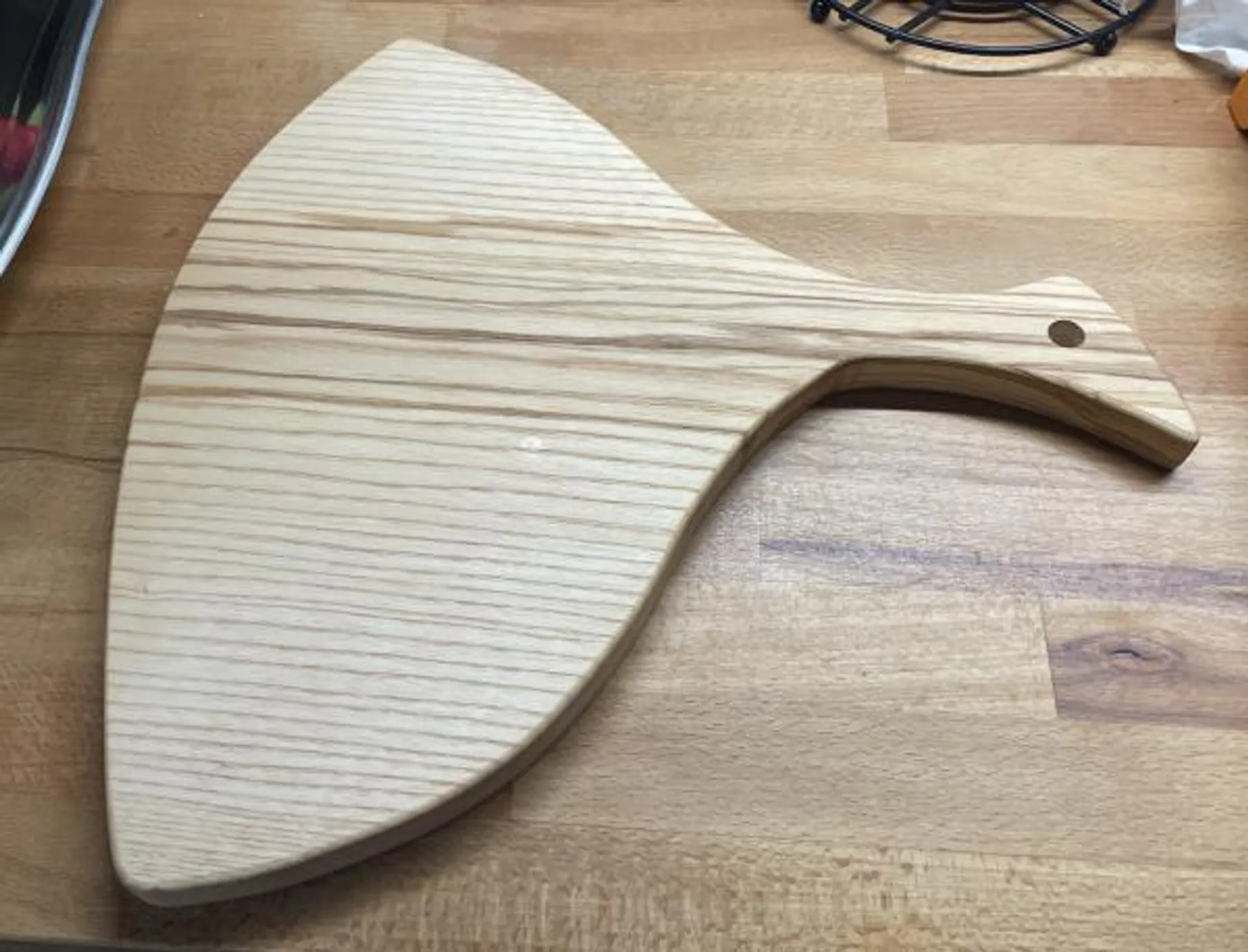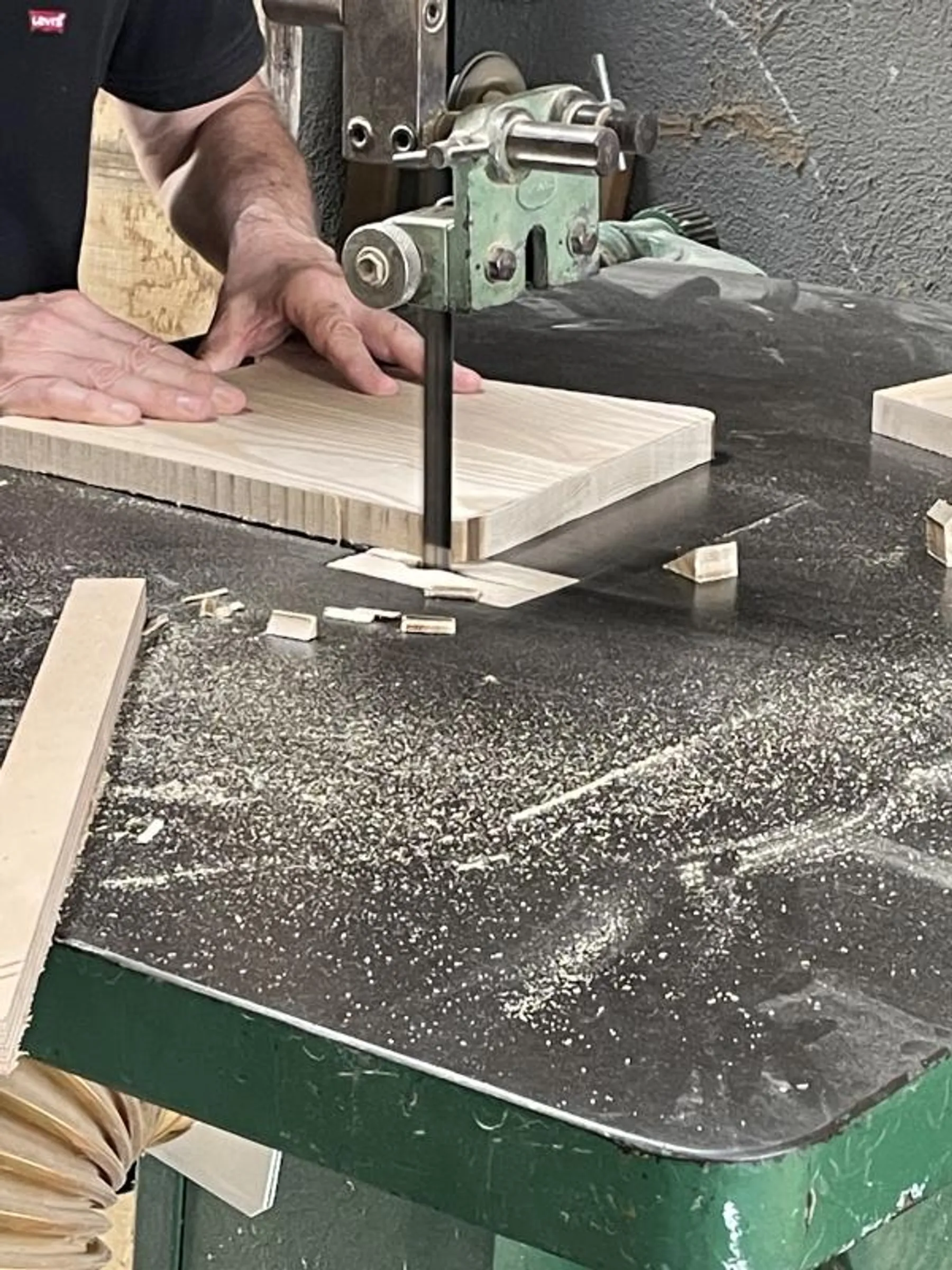 Vous commencerez par découper la forme de votre planche à la scie à ruban, en vous entraînant d’abord sur des chutes de bois.
