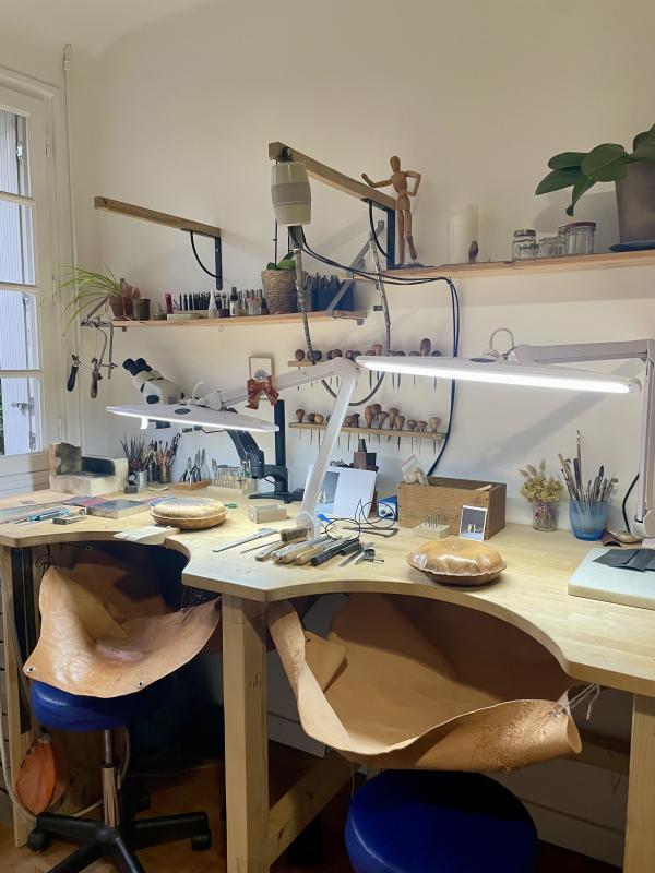 Une fois votre concept défini, place à la confection ! Bénédicte vous initiera aux techniques de sculpture sur cire et vous guidera dans chaque étape. Armés de scalpels, limes et spatules chauffantes, vous façonnerez ensemble vos alliances, donnant vie à votre vision. Tout au long du processus, l’artisane sera à vos côtés pour affiner les détails et vous accompagner dans la maîtrise des gestes essentiels.