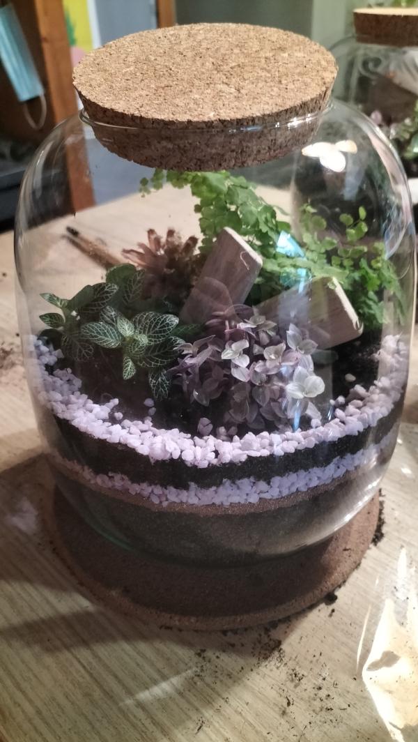 Atelier réalisé au mois d'avril, j'ai passé un super moment de détente tout en jardinant, c'était très agréable. Il y avait beaucoup de choix de plantes et aussi au niveau du matériel. Nous avons eu de supers conseils quant à l'entretient du terrarium. Depuis ce printemps, il va toujours aussi bien. Merci !