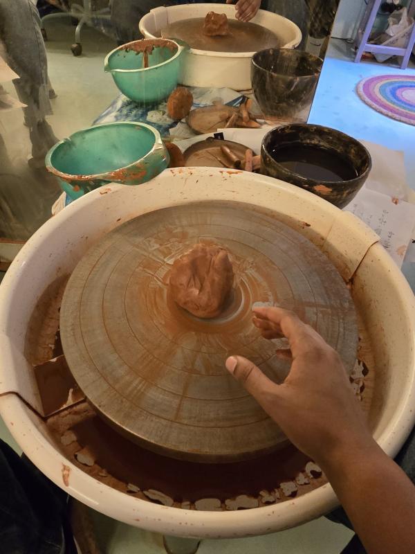 Puis, Claire vous apprendra à donner forme à votre balle de terre. Petit à petit, vos objets se créeront sous vos mains en suivant les mouvements du tour. Vous pourrez également les décorer à l'engobe pour faire des motifs ou apporter de la couleur.