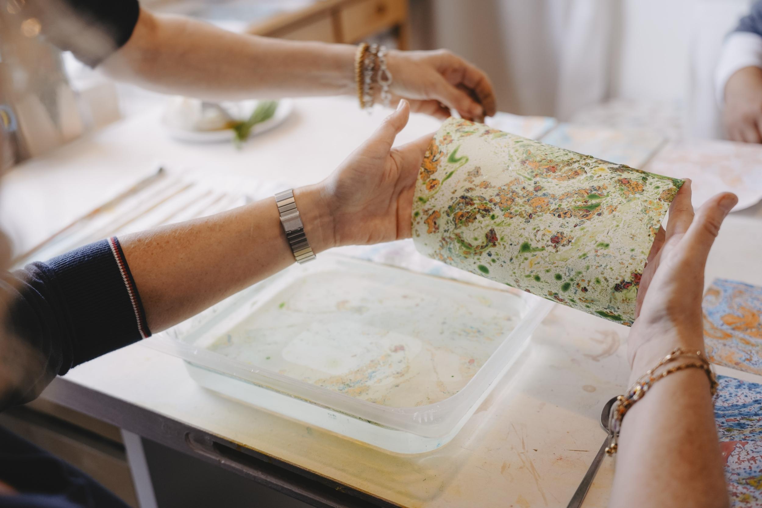L'artisane vous guidera ensuite pour chaque étape : déposer des gouttes de peinture à l'huile sur l'eau, animer les couleurs en soufflant à la surface, tracer des motifs à l'aide d'une baguette...