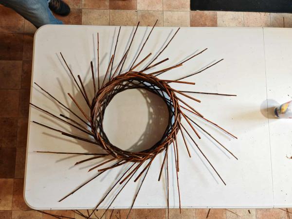 L'atelier débutera par le tri des brins d'osier. Vous sélectionnerez alors les brins qui serviront de « montants », ceux qui composeront les différentes « torches », et ceux qui constitueront la « clôture ». Les montants formeront l'ossature et la bordure en étoile de votre suspension, tandis que les torches assureront un tressage solide pour maintenir l'ensemble.