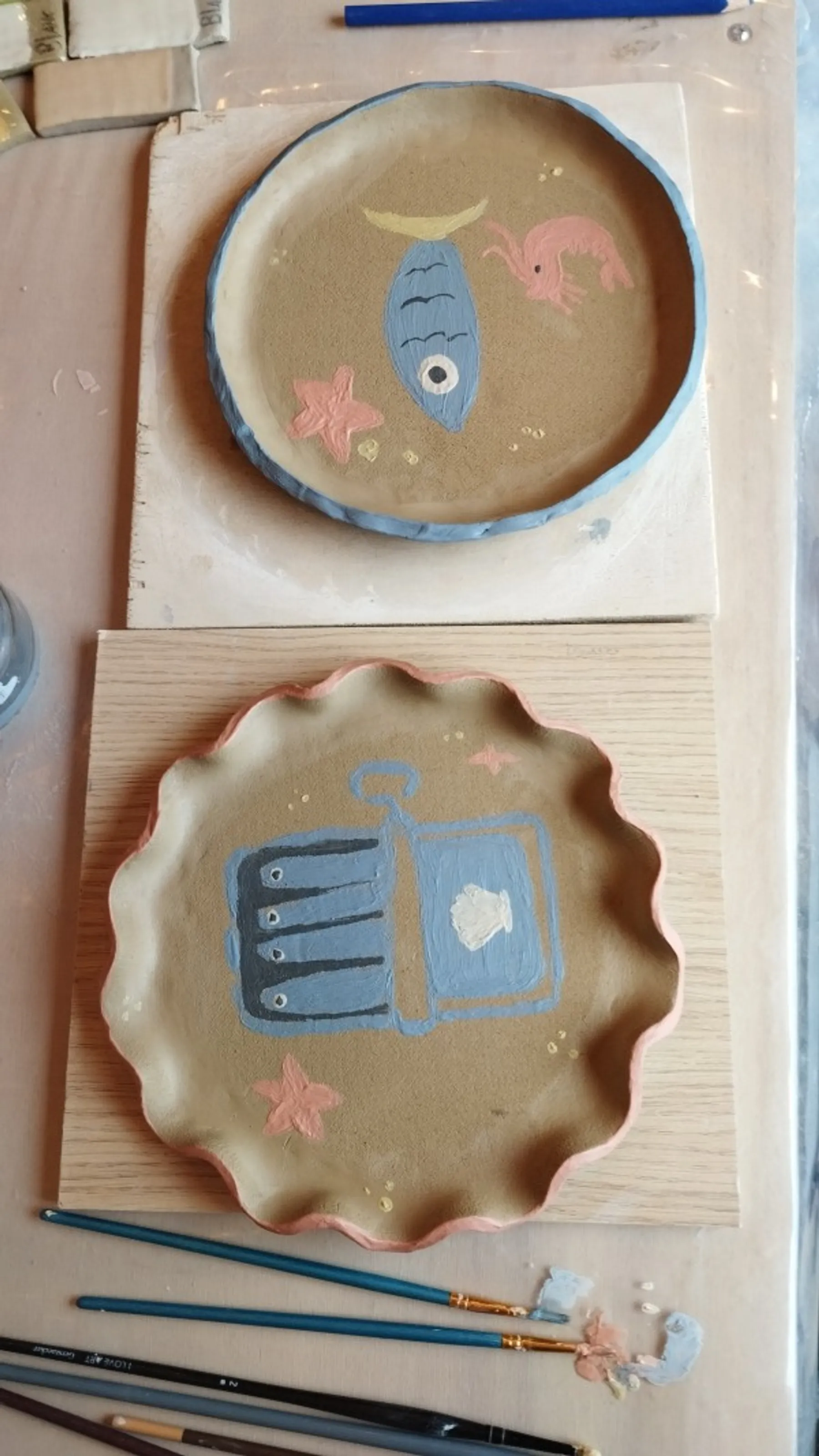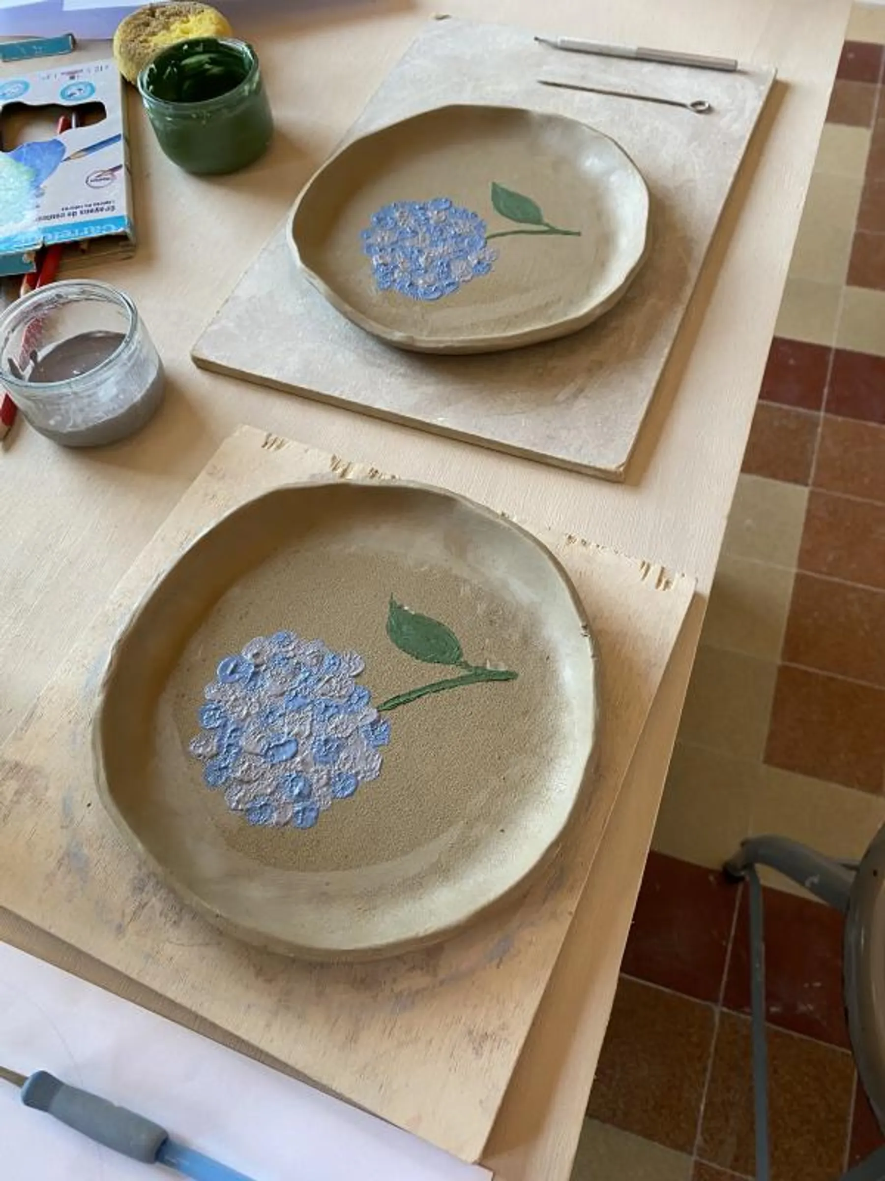 Après un petit temps de séchage, place à la décoration ! Florine mettra à votre disposition de nombreux engobes et vous enseignera différentes techniques de décoration afin de décorer et de colorer au mieux vos assiettes.