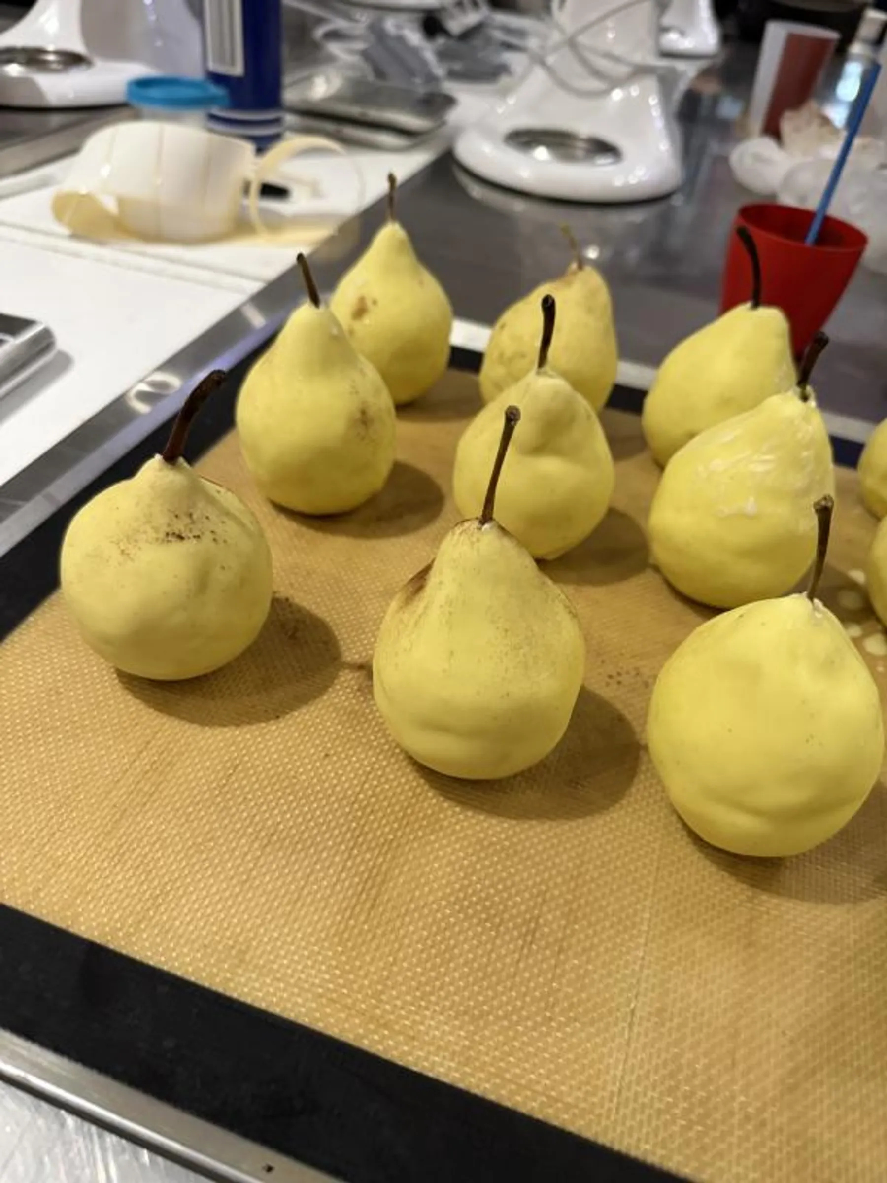 En fonction des saisons, vous choisirez ensemble un fruit à recréer : pomme, citron, noisette, poire ou fraise, tous aussi appétissants les uns que les autres. Dès le début, vous apprendrez à préparer chaque élément de votre trompe l’œil, en suivant les différentes étapes sous la supervision de Virginie. Vous découvrirez comment réaliser des gels de fruits, des mousses légères, des ganaches fondantes, des confits de fruits et des coques en chocolat. Chaque détail sera expliqué avec soin pour que vous compreniez parfaitement les gestes techniques nécessaires à la réussite de votre œuvre.
