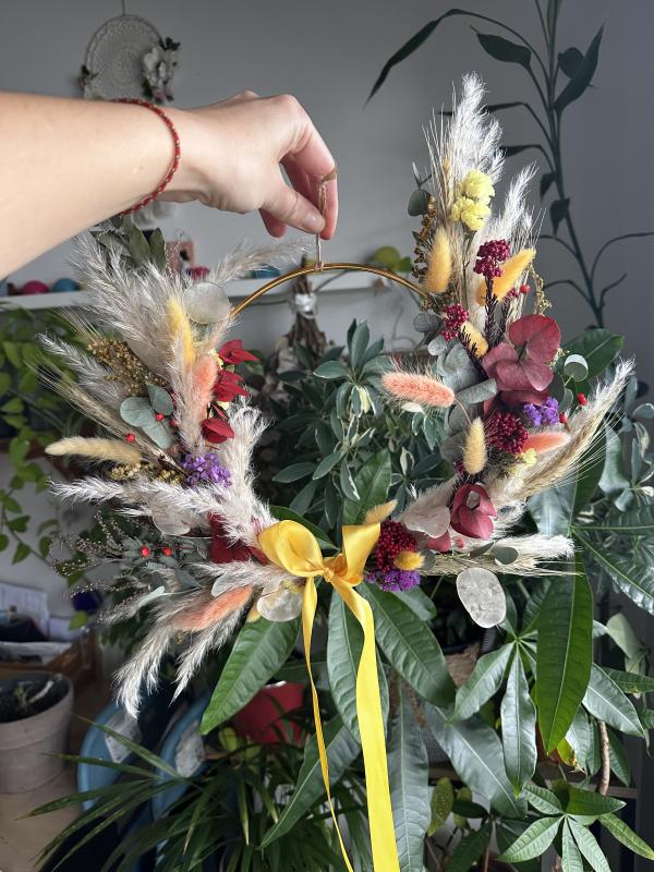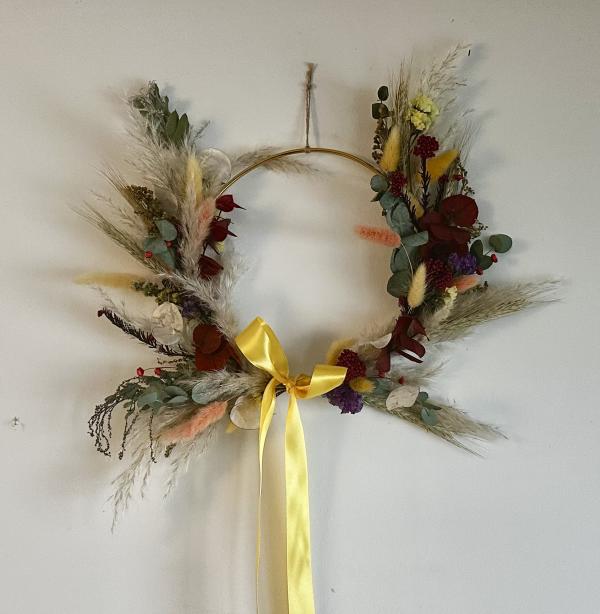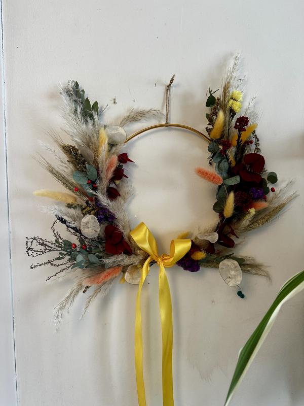 Pendant cet atelier, vous réaliserez une couronne décorative en fleurs séchées (demi-cercle) avec laquelle vous repartirez. Vous pourrez l'installer sur une porte ou sur un mur, dans votre salon ou dans une chambre.