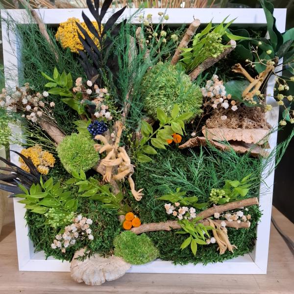 Après une brève introduction théorique, vous aurez accès à une grande variété de végétaux stabilisés, séchés ou semi-naturels, rassemblés dans un capharnaüm végétal inspirant. Tout le matériel nécessaire sera à votre disposition pour confectionner un cadre végétal unique de 30 cm x 30 cm, prêt à être installé chez vous avec son système de fixation inclus.