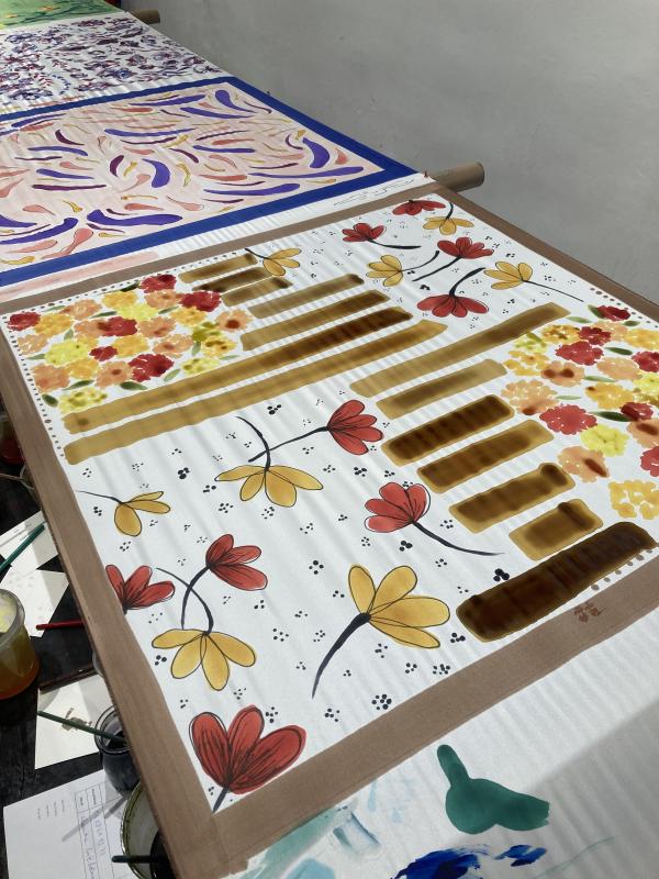 • Accueil et introduction : Lucie vous présente son univers, les longues tables de peint-main où sont tendus les rouleaux de soie. Elle prend le temps de vous partager les bases de la peinture sur soie et le déroulé de la séance.