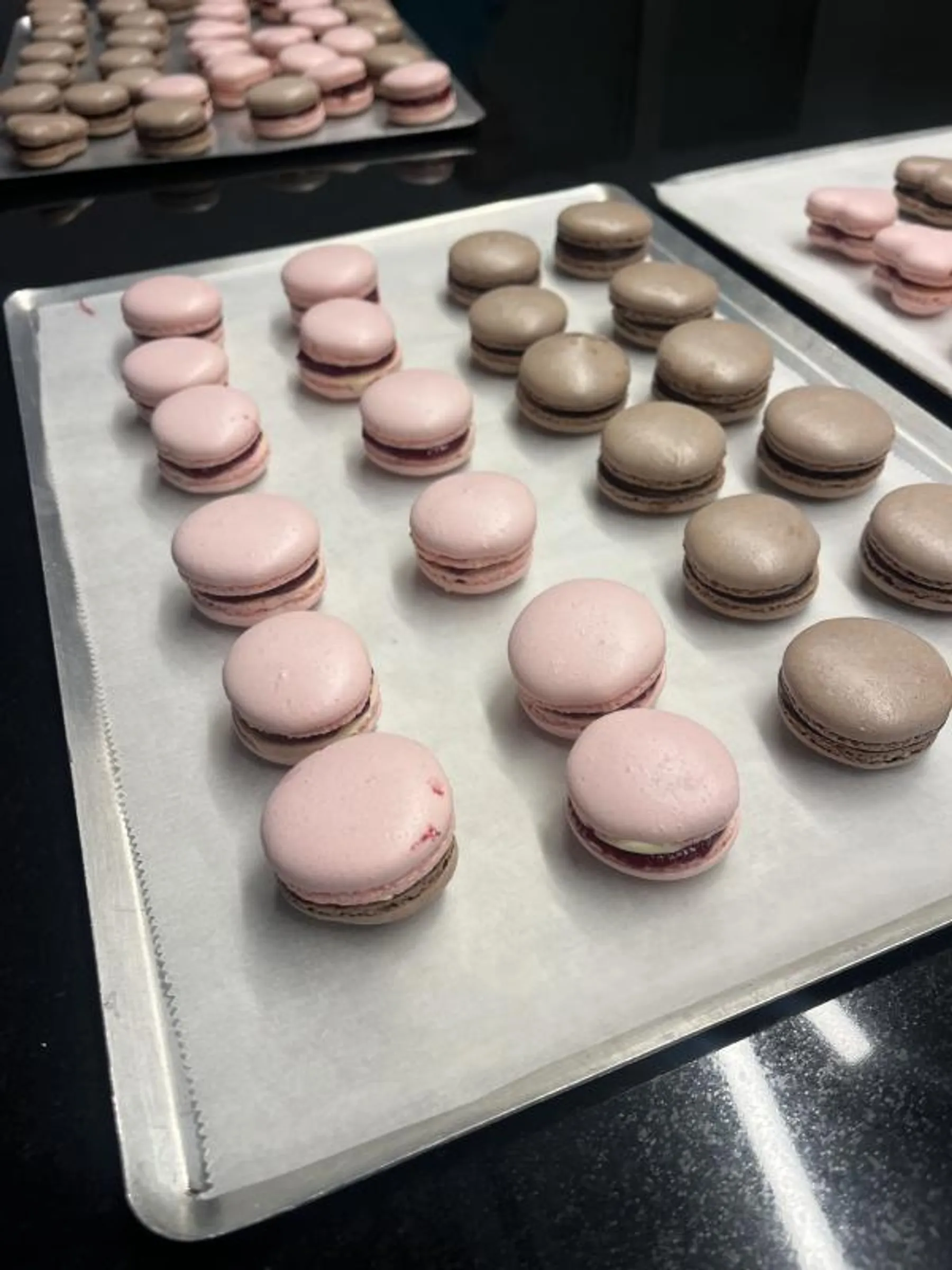 Ensuite, vous réaliserez votre propre pâte en y intégrant votre colorant. Vous poursuivrez l'aventure en pochant les coques sur des plaques de cuisson, tout en veillant à obtenir des formes homogènes.