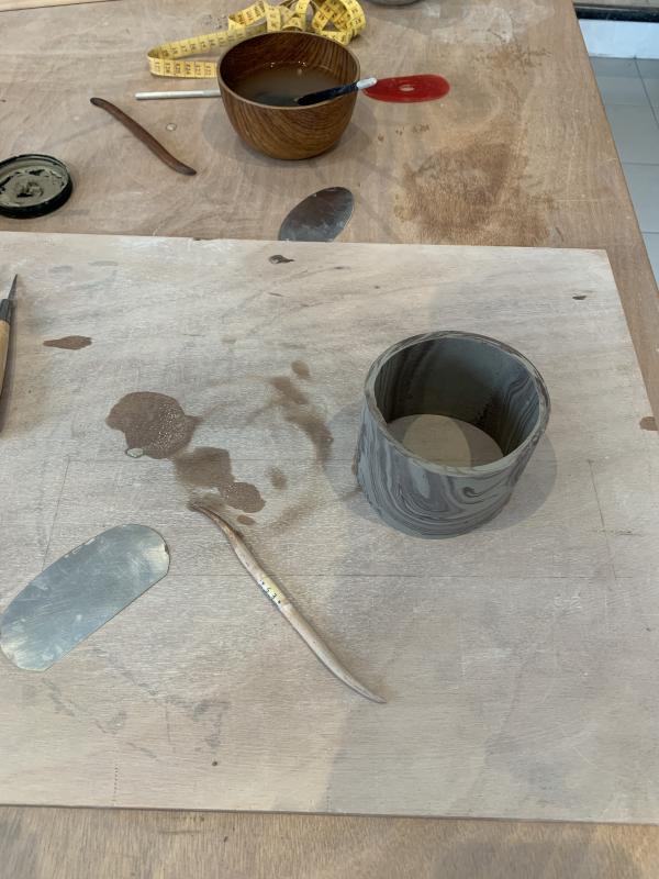 Ensuite, vous serez initié aux méthodes de la plaque ou du pincé pour modeler votre pièce. Vous procéderez au montage des parois en conservant vos motifs marbrés et finirez par l'ajout d’une anse en terre assortie (facultatif selon le design choisi).