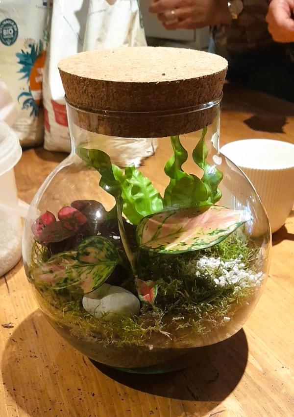 L'atelier terrarium est un moment très agréable à partager avec les autres participantes ! On apprend pleins de choses sur les plantes et je suis très fière de mon petit terrarium !