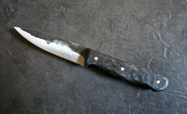 Une journée très sympa pour toucher du doigt les différentes étapes de la fabrication d'un couteau. De la forge au backstand, en passant par l'enclume, Thomas fait preuve de pédagogie. Le choix du matériau pour façonner son manche permet de personnaliser son couteau. Pour ma part, j'ai choisi du Morta (chêne enfoui dans de la tourbe, en cours de fossilisation). Et j'ai choisi de donner à mon manche un aspect brut, pour faire écho à la lame, brute de forge.