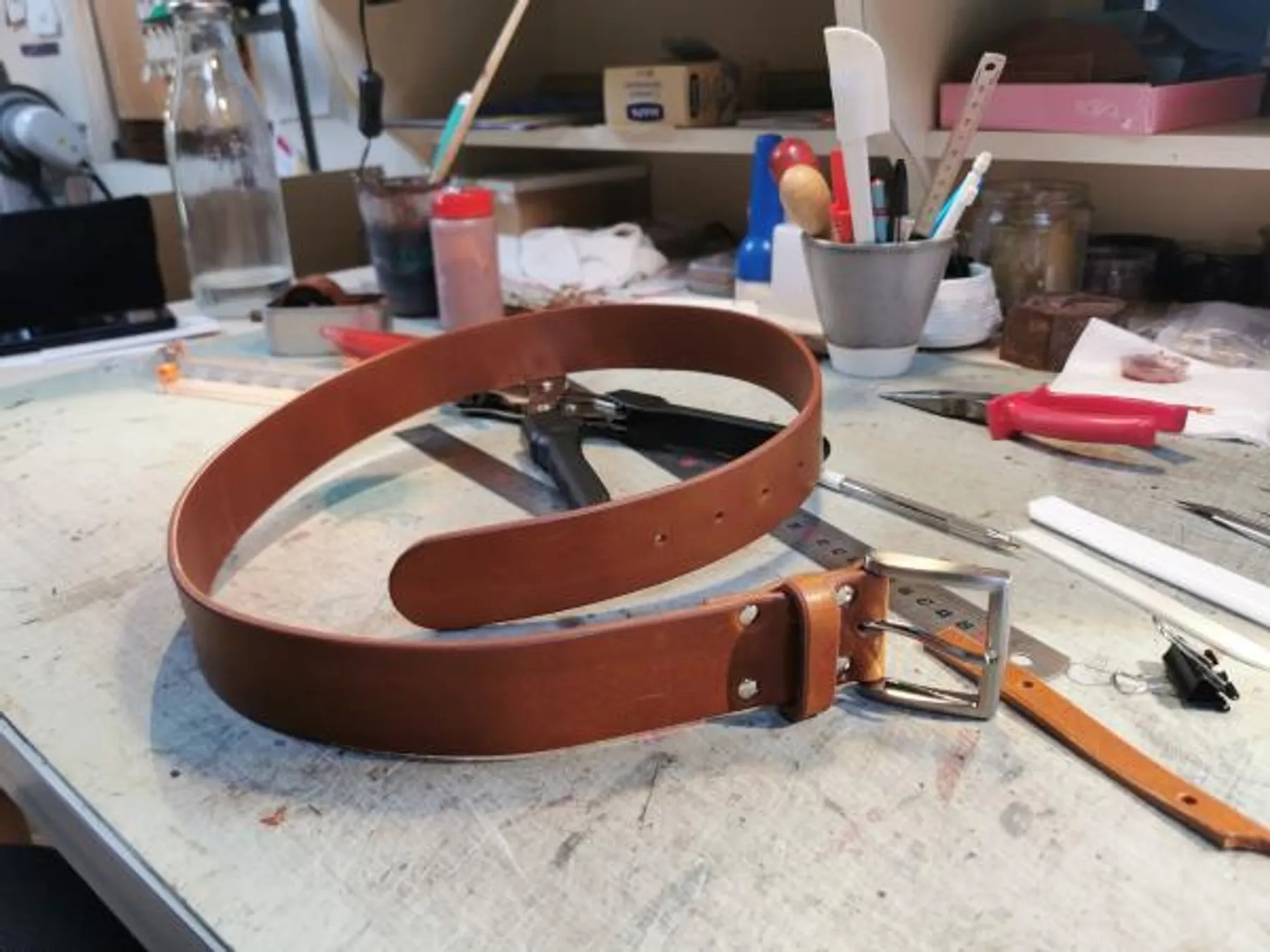 Bienvenue dans l'atelier d'Anne ! Vous aurez le choix de la boucle et du cuir, parmi un large choix de cuirs tannés avec des végétaux : chocolat, marron vieilli, noir, cognac mais aussi rouge et violet.