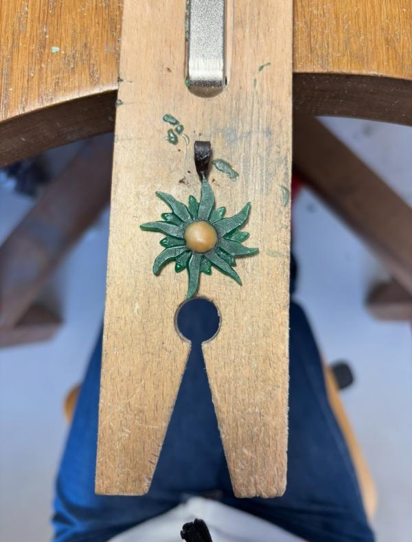 À la fin de l'atelier, vous affinerez votre pendentif avec des limes et des outils de finition. Bérenger et Zoé prendront un moment pour expliquer les étapes suivantes : la transformation de votre création en métal, notamment le moulage, la coulée en laiton plaqué or et les finitions. Les bijoux seront fondus par leurs soins après l'atelier, et vous pourrez venir les récupérer environ 10 jours plus tard.