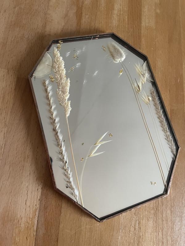 L'étape suivante est celle qui rend l'atelier de Céline vraiment spécial : l'insertion de végétaux. Vous aurez l'occasion de sélectionner des végétaux séchés dans la collection de Céline, récoltés et préparés avec soin. Ces éléments naturels seront pressés entre deux verres, ajoutant une dimension poétique et originale à votre miroir.