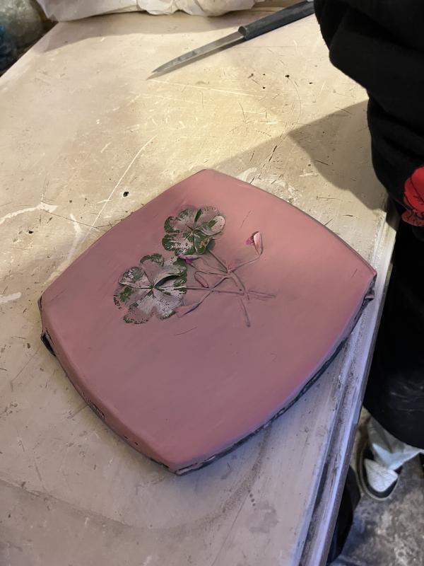 Ensuite, direction le jardin pour cueillir les feuilles et fleurs qui serviront à créer vos empreintes. Vous poserez les végétaux sur la pièce avant d’appliquer une première couche d’engobe coloré.