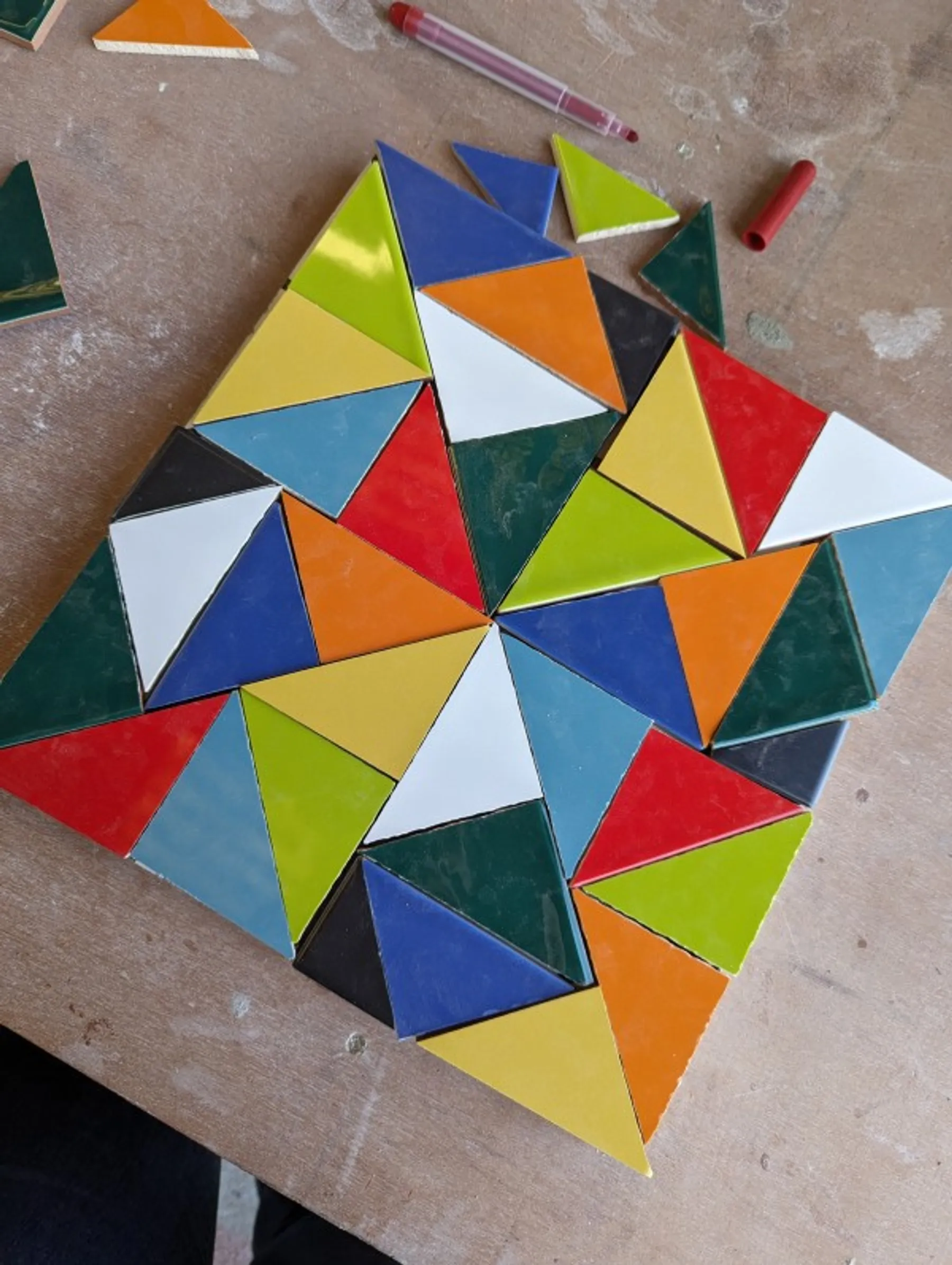 Laissez libre cours à vos inspirations en choisissant un dessin géométrique ainsi que des pièces en carrelage parmi une variété éblouissante de couleurs et de formes. Vous utiliserez des pinces et divers outils de carreleur pour découper les pièces et donner vie à vos compositions que seront ensuite soigneusement collées sur des panneaux de bois.
