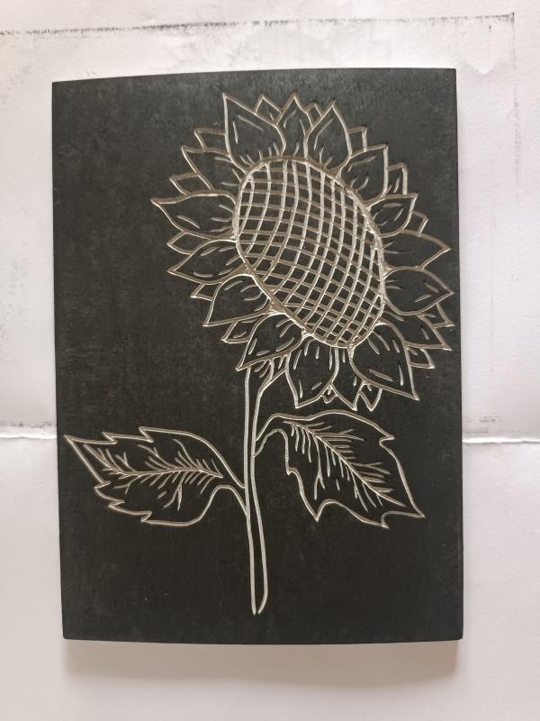 Une fois la gravure terminée, vous procéderez à son impression. Le papier sera positionné sur la plaque de lino et passera sous la presse. Moment magique, vous verrez alors votre motif apparaître !
