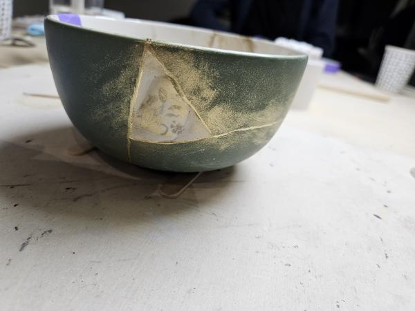 Enfin, vous viendrez ajouter au kintsugi une pièce issue d'une autre poterie, créant ainsi votre œuvre en yobitsugi.