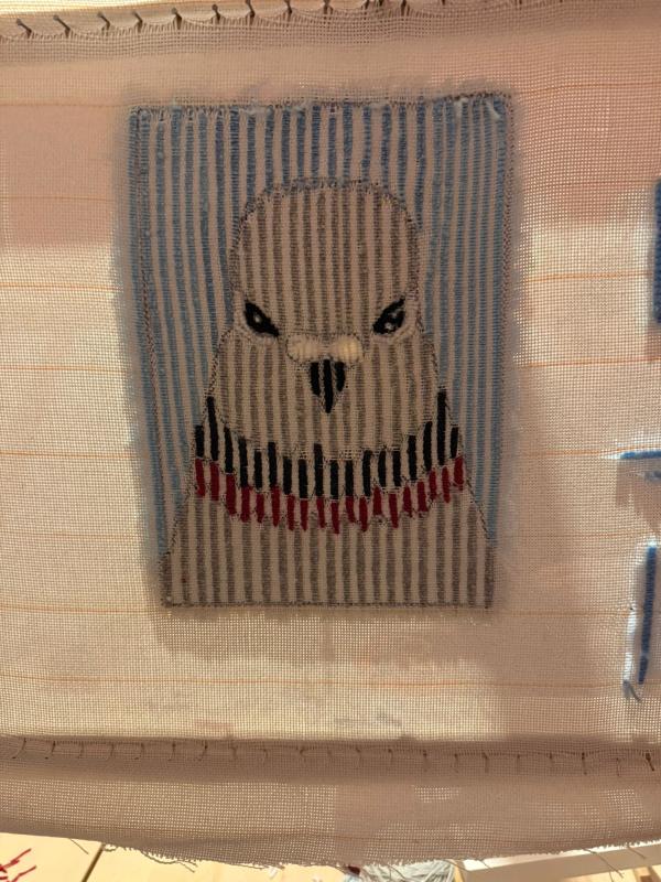 La toile sera ensuite décrochée, enduite d’une colle spéciale et égalisée à la tondeuse pour harmoniser les fibres. Les bords seront rabattus, afin que l'artisane puisse coller l’ensemble directement sur le verre du cadre.