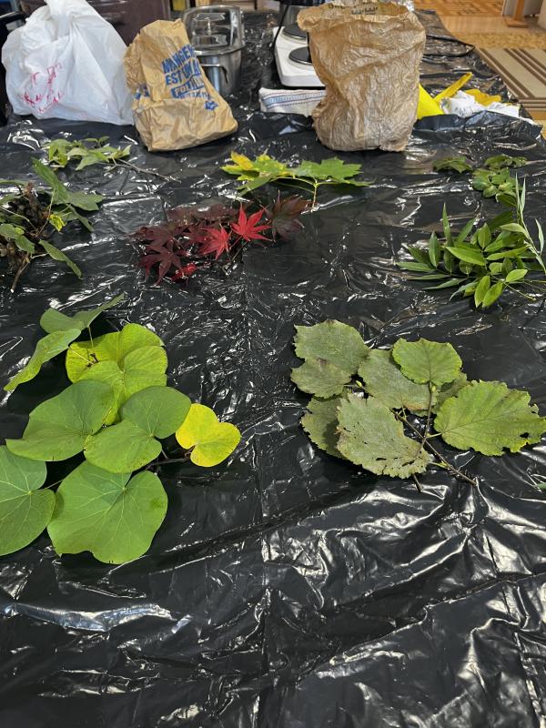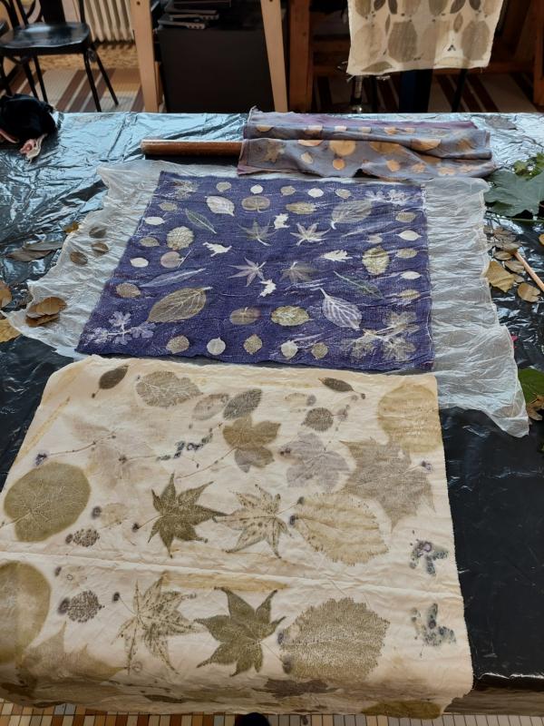 Quelle belle découverte que cet atelier dans un lieu magnifique : des végétaux cueillis à deux pas de l'atelier, du tissu, de la teinture végétale, laissez libre cours à votre imagination en disposant vos feuilles sur le tissu et découvrez ce que la teinture va vous révéler après une cuisson vapeur. Merci Adeline pour ce partage de connaissances et votre bonne humeur.