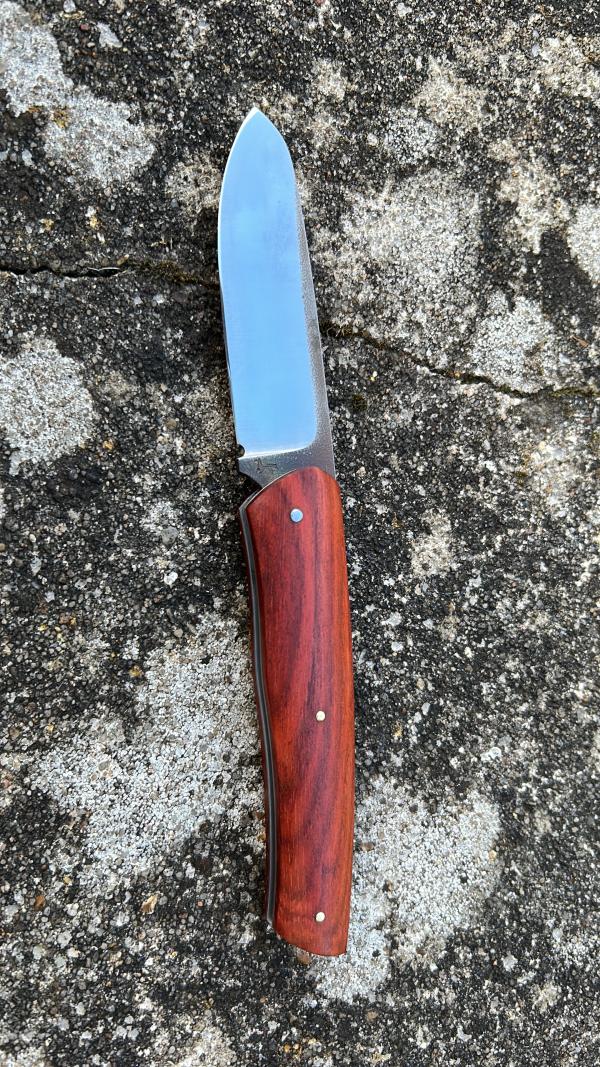 Un excellent moment passé avec Adrien, artisan passionné et prêt à faire partager ses connaissances. En 1 jour et demi, on réalise un couteau à 2 avec Adrien qui nous donne toutes les explications théoriques sur le dessin, sur le fonctionnement du cran forcé et les points de réglage à effectuer , ensuite il nous montre les actions à réaliser (traçage, perçage et usinage) en commençant lui-même avant de nous laisser faire. Il nous guide parfaitement avec ses conseils et nous laisse décider quand lui redonner la main pour les parties délicates (avant que l’irréparable n’arrive…). Je repars avec un couteau d’une très belle finition, qui rejoint ma modeste collection mais avec une particularité unique : j’ai participé à sa fabrication. Merci encore Adrien pour ce moment exceptionnel.