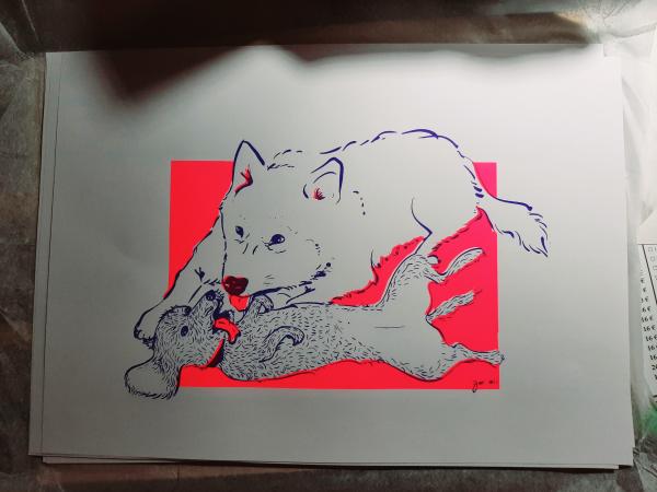 L'après-midi sera destinée aux impressions. Victor vous apprendra tous les gestes de précision du sérigraphe : caler, napper, imprimer et sécher la première couleur avant de vous lancer dans le second passage et la seconde couleur.