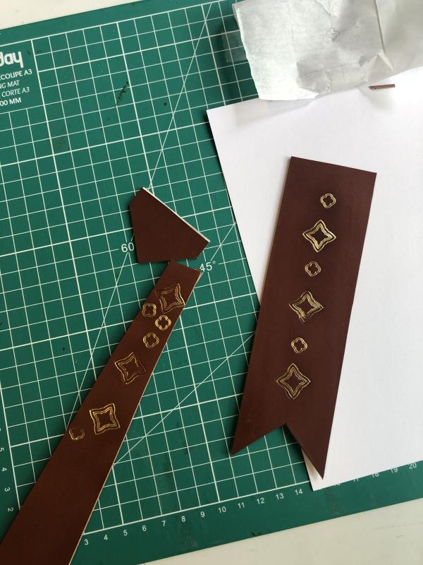 Une fois à l'aise et après découpage de la forme finale de votre marque-page, vous appliquerez le film or 22 carats sur votre pièce. Votre création prendra forme : recto en cuir doré, verso en papier marbré, pour un résultat à la fois élégant et poétique.