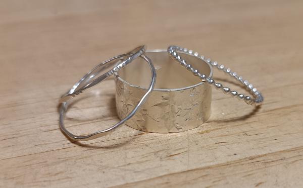 • Soudure et fabrication des anneaux : soudez et dérochez votre bande d’argent en la plongeant dans un bain d'acide chaud après la brasure, puis réalisez trois anneaux en fil d’argent - deux fins et un perlé - qui viendront coulisser autour de votre bague.