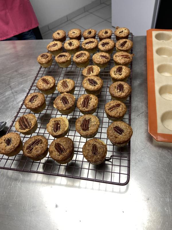 Pendant que vos pecan pies cuiront au four pendant une trentaine de minutes, vous pourrez profiter d’un moment de détente autour d’une boisson chaude ou d’un café. À la fin de l’atelier, vous démoulerez vos créations et repartirez avec 6 pecan pies individuelles, prêtes à être dégustées.