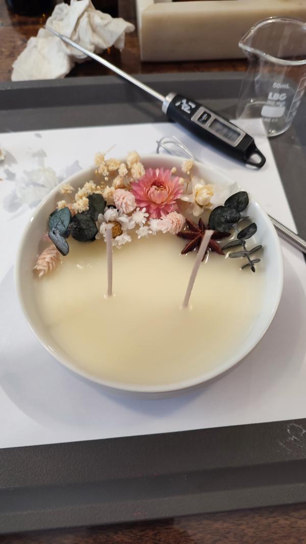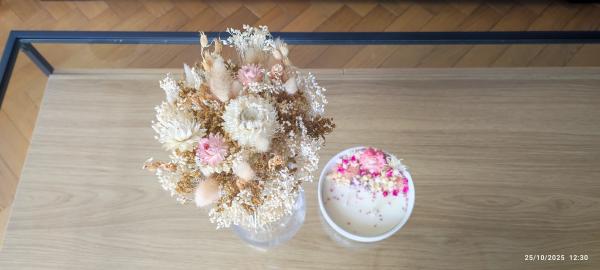Vous aurez également le temps de réfléchir à la composition florale que vous souhaitez créer pour votre bougie : de magnifiques fleurs et feuilles séchées seront mises à votre disposition.